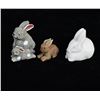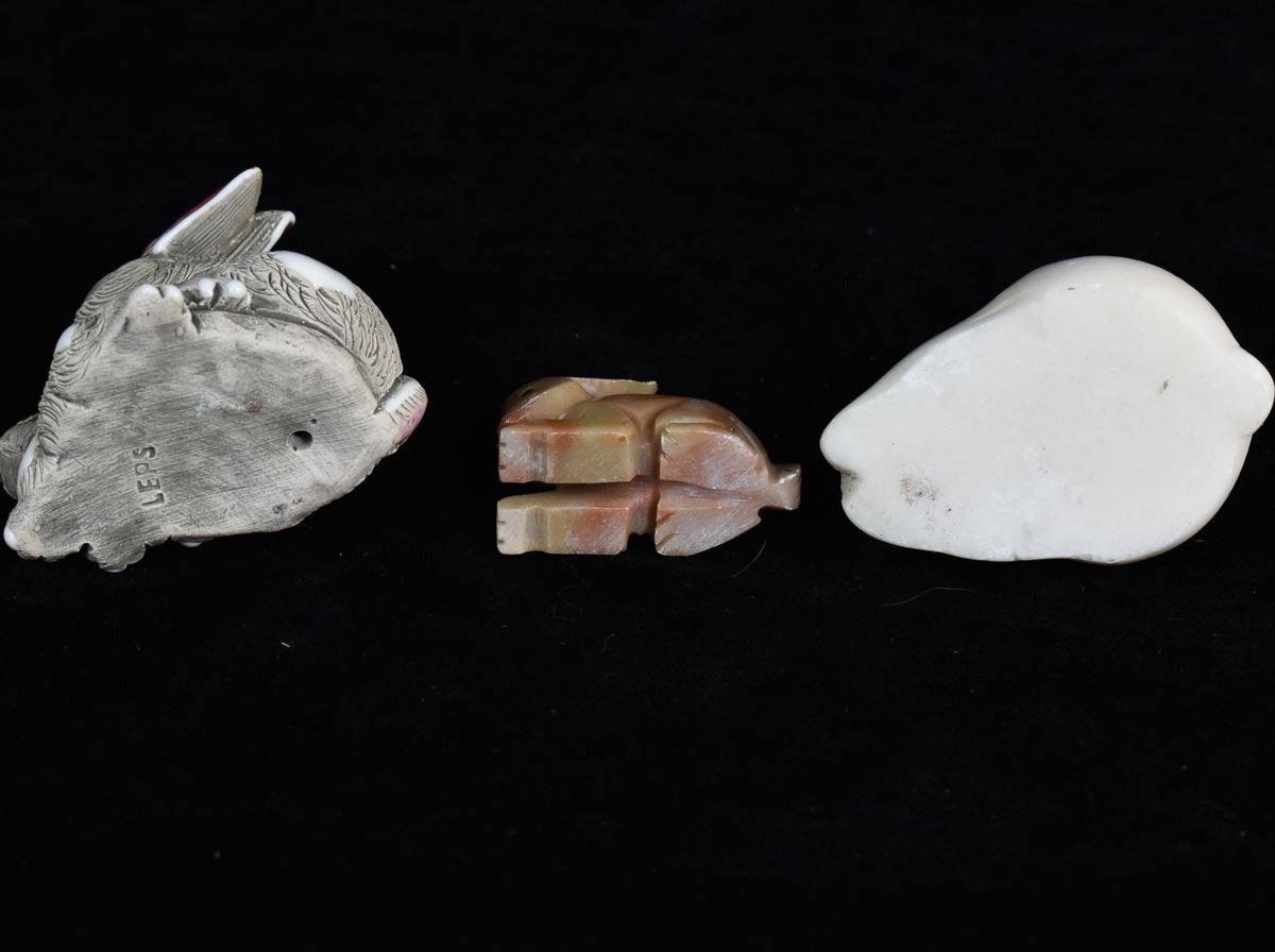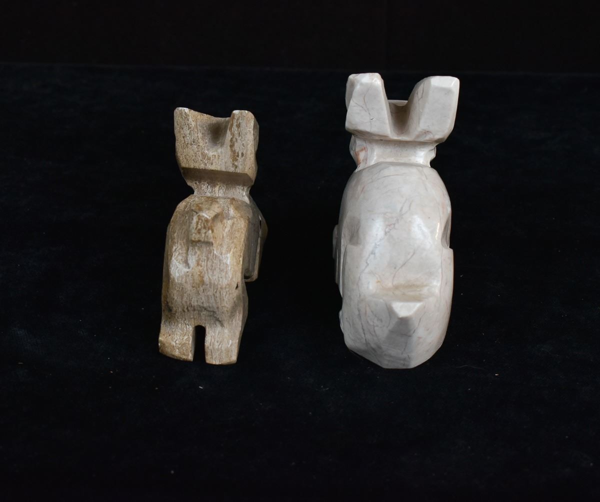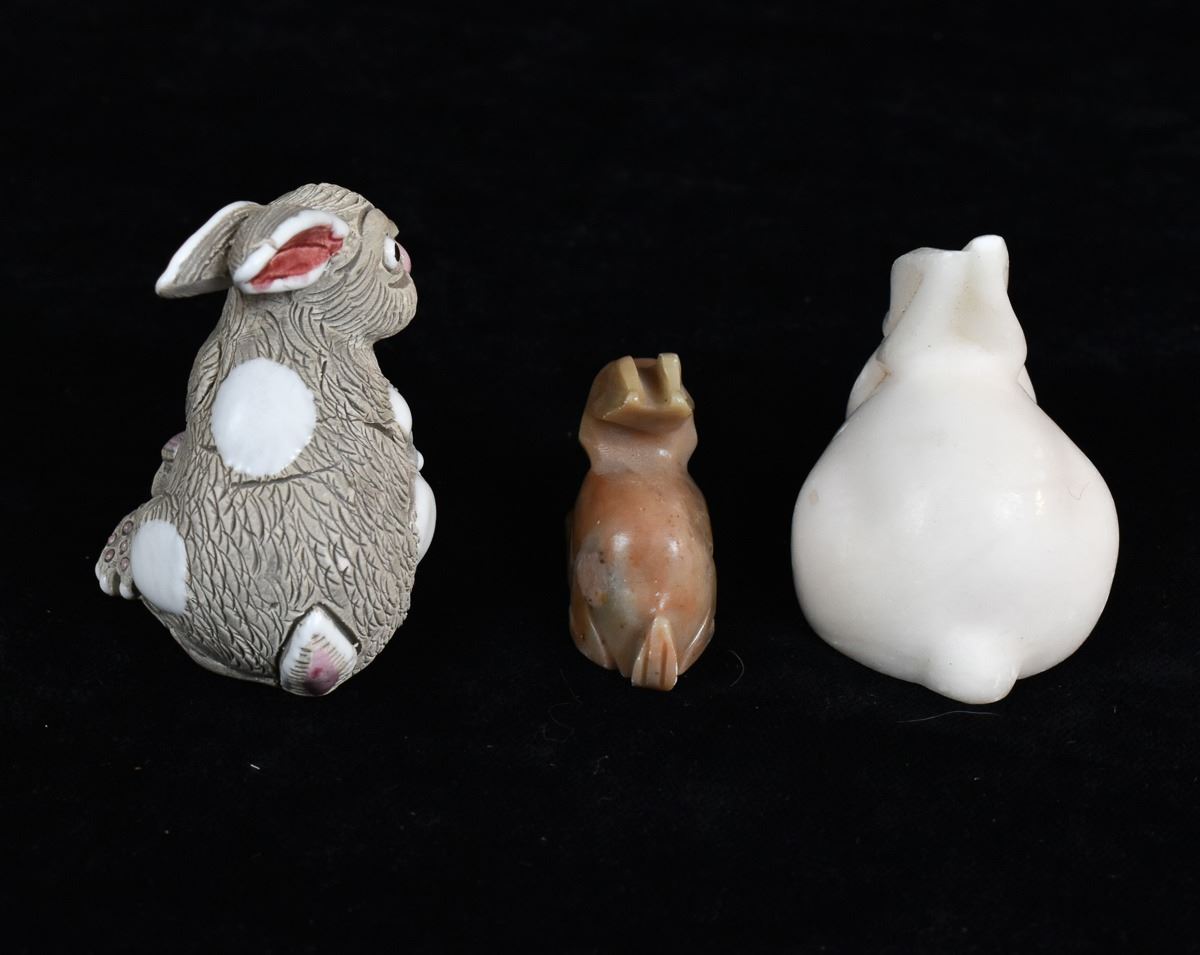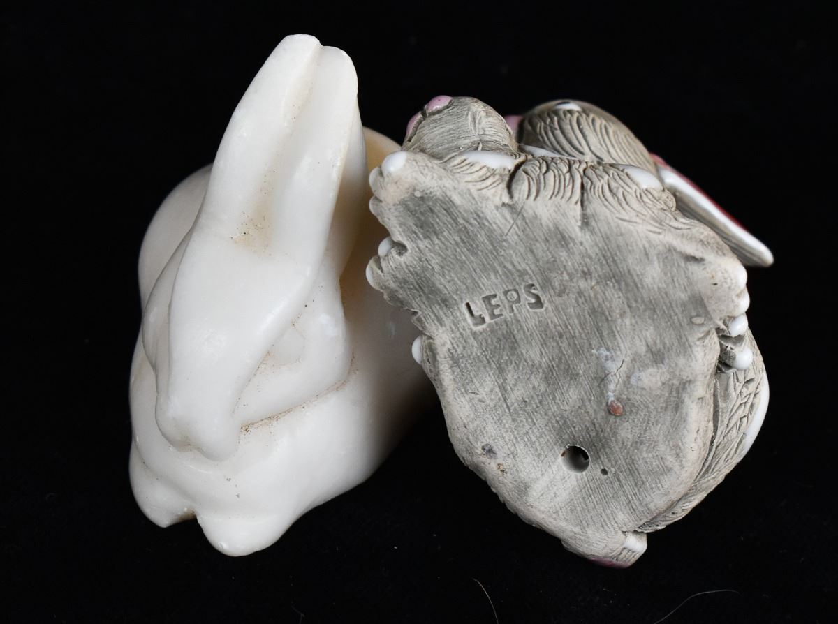 5 Rabbit Figurines, includes 3 Onyx, 1 White Marble, and 1 LEPS Pottery, largest measures 1.25'' x 3'' x 3.5''