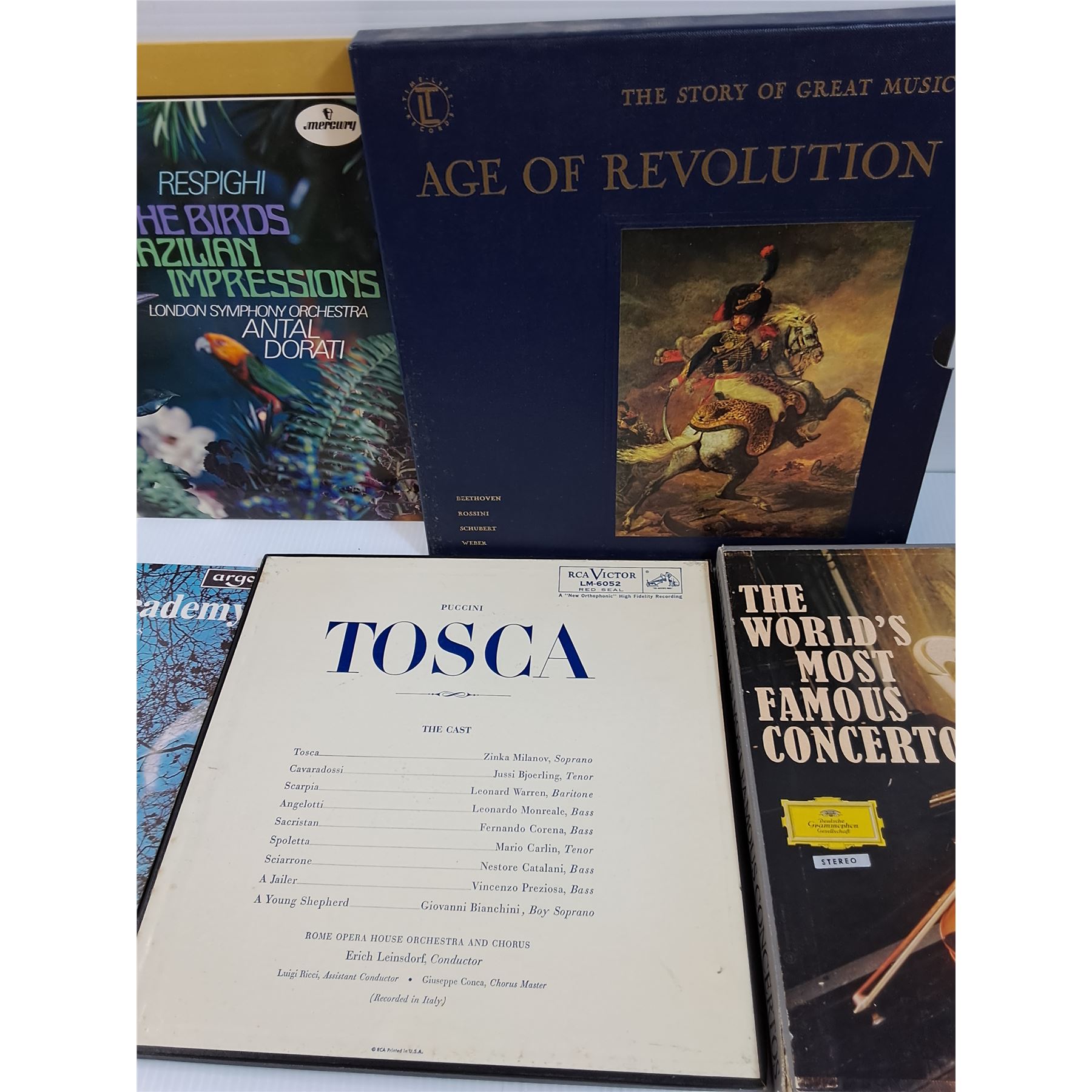 (5) Records: Age of Revolution Set, Famous Concertos Set, Tosca Set, Bird Impressions, Academy