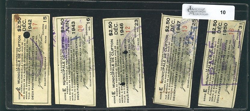 5 Redeemed coupon from City of Clifton bond, valued at $2.50 each and dated 1942, 1943, 1946, 1947 & 1950,