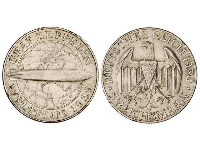 5 Reichsmark. 1930-F. REPÚBLICA DE WEIMAR. STUTTGART. AR. Zeppelín. (Golpecitos en canto). KM-68. EBC.