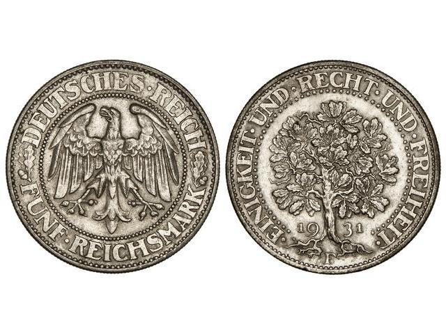 5 Reichsmark. 1931-F. REPÚBLICA DE WEIMAR. AR. Árbol. KM-56. EBC.