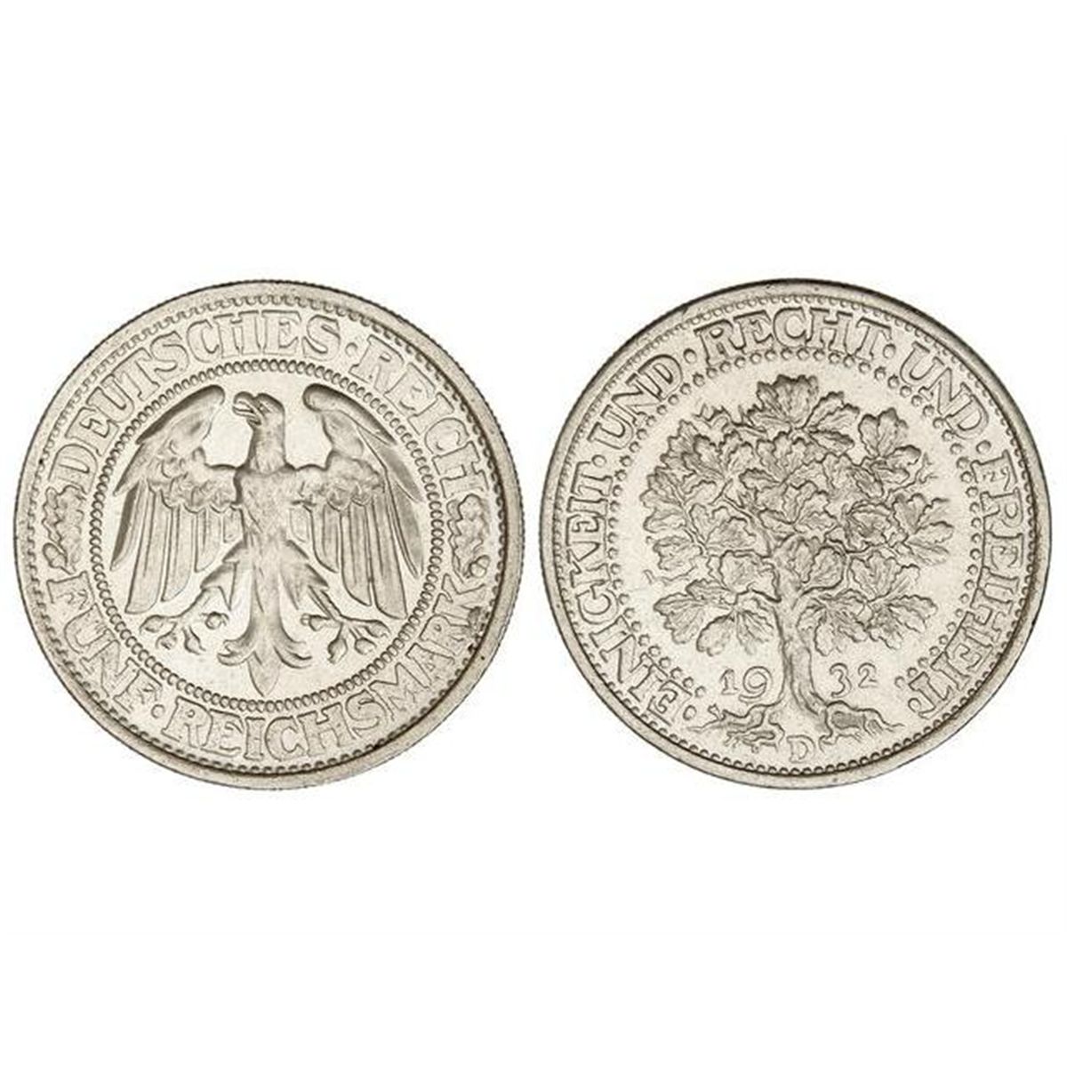 5 Reichsmark. - 1932-D. - REPÚBLICA de WEIMAR. - AR. Árbol. (Leves golpecitos en gráfila). KM-56. EBC. - -