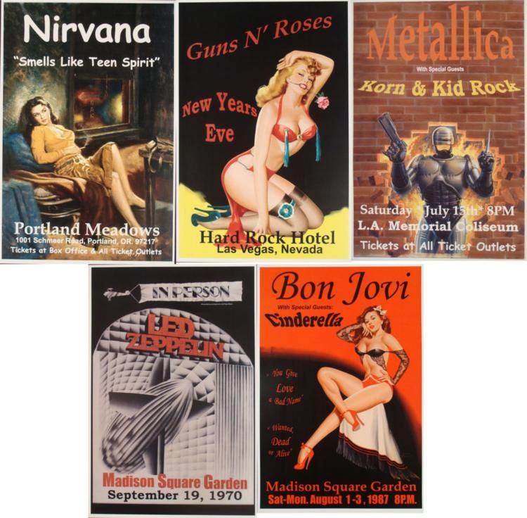 Here are 5 reproductions of original concert posters from some of the greatest 1970's and 1980's bands.Condition: Excellent Size: 12" x 18" Posters:Led Zepplin (Madison Square Garden; September 19, 1970)Nirvana: "Smells Like Team Spirit" (Portland Meadows)Metallica w/special Guest Korn and Kid Rock (L.A. Memorial Coliseum; July 15th)Guns N' Roses (Hard Rock Hotel; Las Vegas, NV, New Years Eve)Bon Jovi w/special guests Cinderella (Madison Square Garden; August 1-3, 1987)