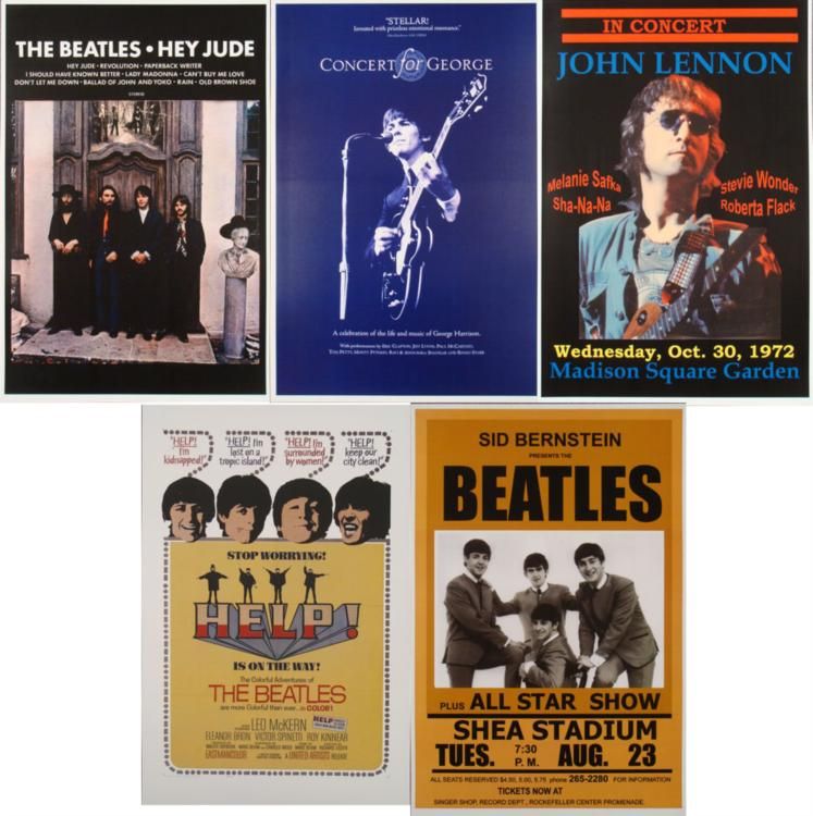 Here are 5 reproductions of original concert posters from one of the greatest bands to ever step foot on stage, the Beatles! * Condition: Excellent Size: 12" x 18" Posters: "Hey Jude" (1970) * "Stop Worrying! Help! Is on the way!" (movie poster, 1965) * at Shea Stadium, August 23rd, 1966"Concert for George - Celebration of the life and music of George Harrison" (2003)John Lenon w/Melanie Safka, Sha-Na-Na, Stevie Wonder, and Roberta Flack (Madison Square Garden; October 30th, 1972) *