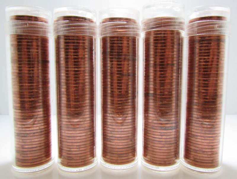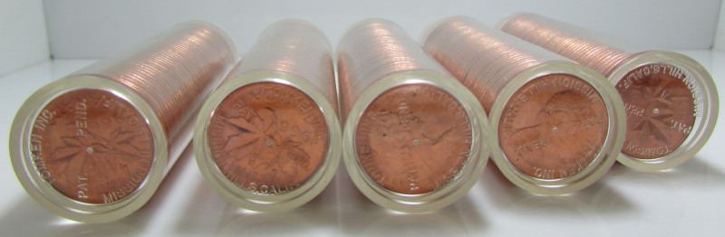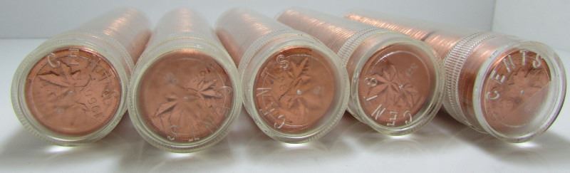5 Rolls - 1966 Canadian Small-Cent Penny Rolls - Red, BU - Directly Out Of A Royal Canadian Mint Bag - 250 Coins!!