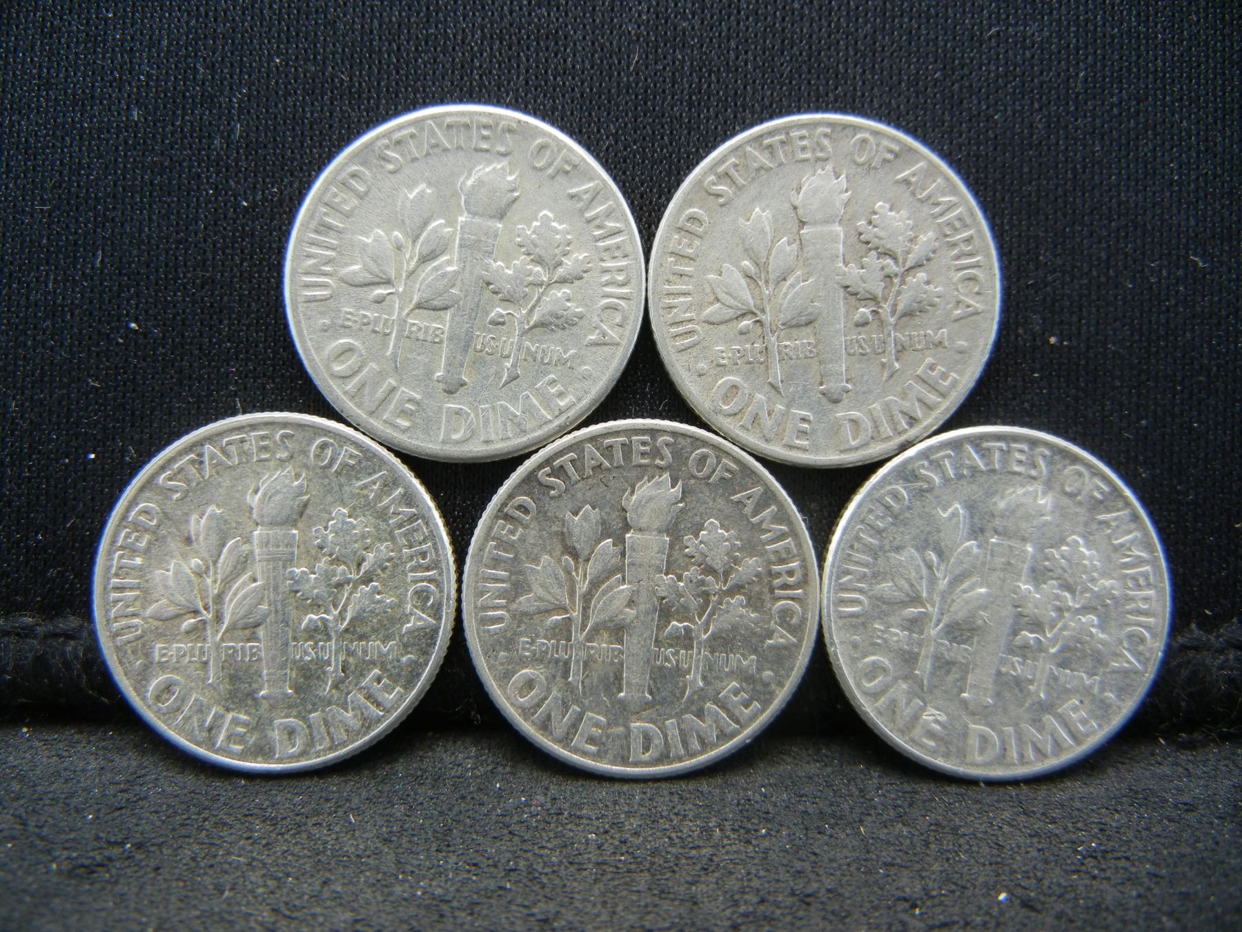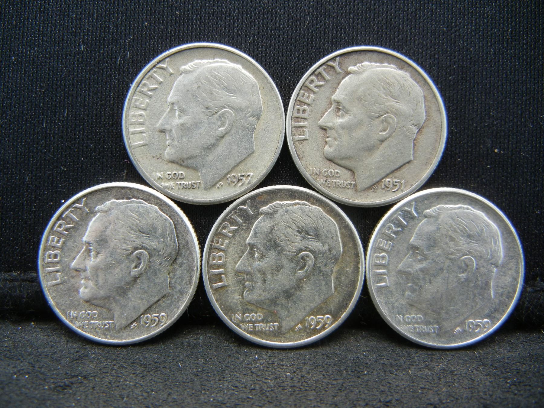 (5) Roosevelt Dimes, 50's, Some Mint Marks