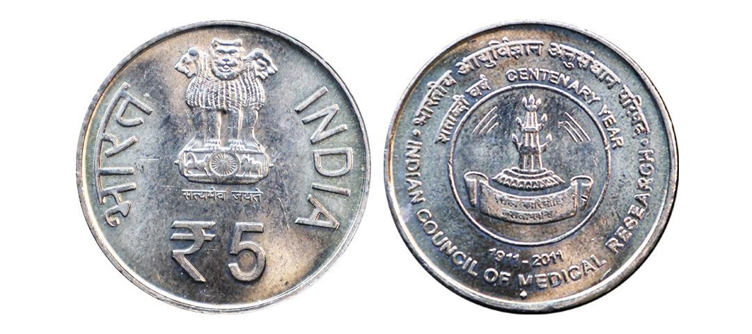 5 Rupee, 5.89 gms, 2011, commemorating the 100th Anniversary of the Indian Council of Medical Resear