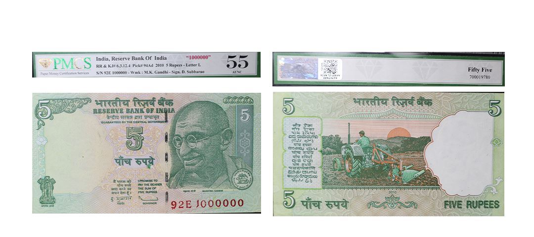 5 Rupees, 2010, Fancy Number, Set of 2 Notes, Signed by D. Subbarao, Inset L, Serial No. 92E 99999 & 92E 1000000, Same Prefix, Graded by PMCS 55 & 58 Aunc, Very Rare.