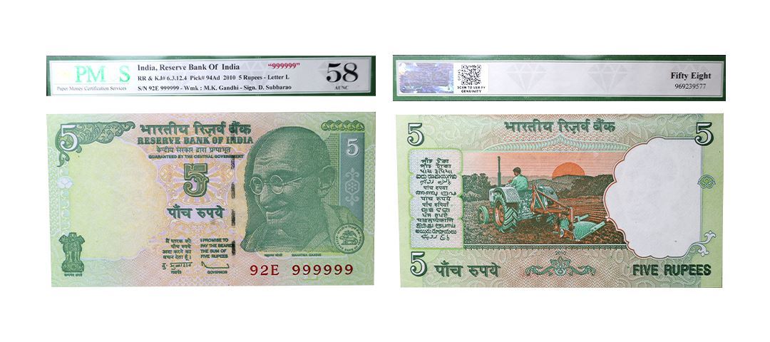 5 Rupees, 2010, Fancy Number, Signed by D. Subbarao, Inset L, Serial No. 64C 000786, Graded by PMCS