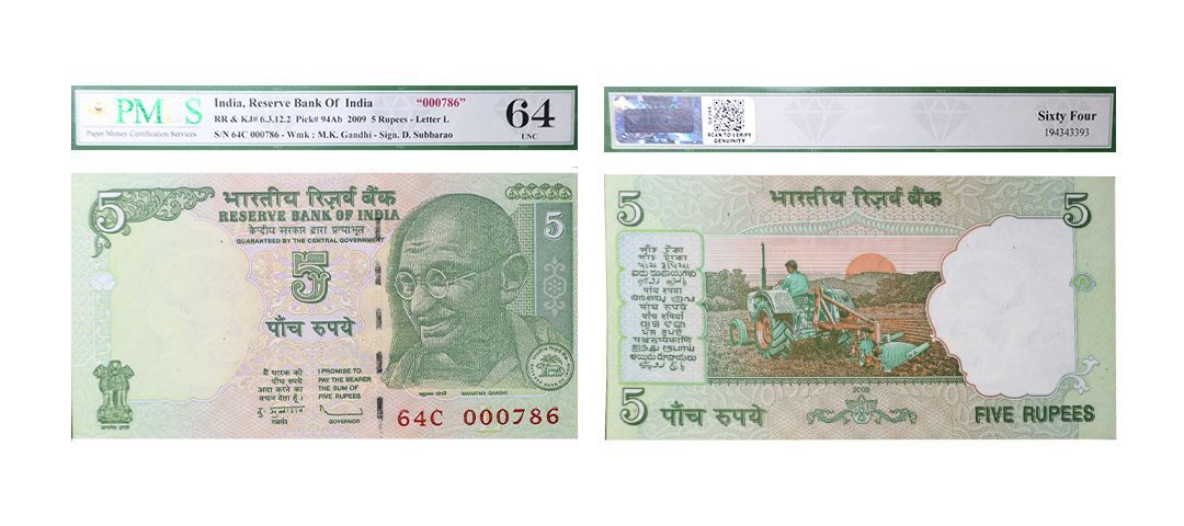 5 Rupees, Fancy Number, Signed by Bimal Jalan, Inset L, Serial No. 22D 111111, PMCS Graded Aunc 55, Stains, Rare.