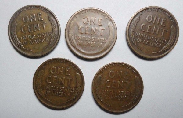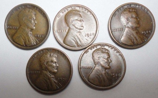 5 "S" Mint Lincoln Cents, 15-S VF,21-S XF, 23-S XF, 24-S VF/XF.26-S XF