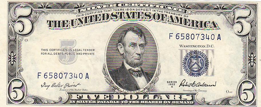 $5 SILVER CERTIFICATE 1953 SNAPPY UNCIRCULATED EMBOSSED