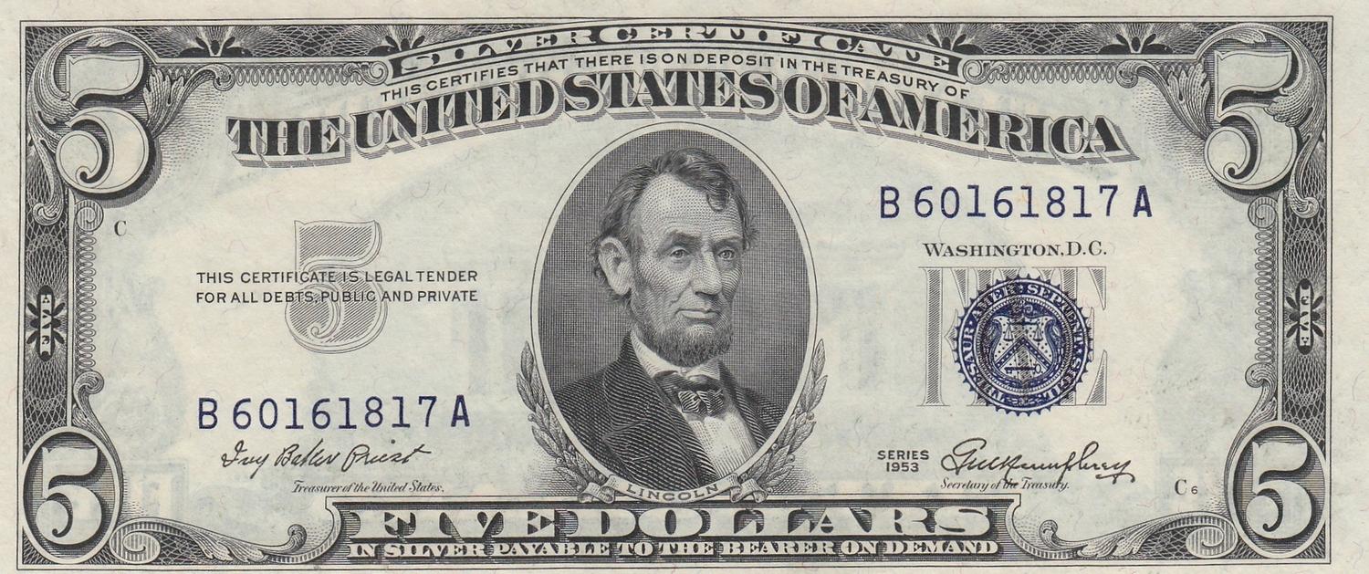 $5 SILVER CERTIFICATE 1953 UNCIRCULATED GREAT MARGINS