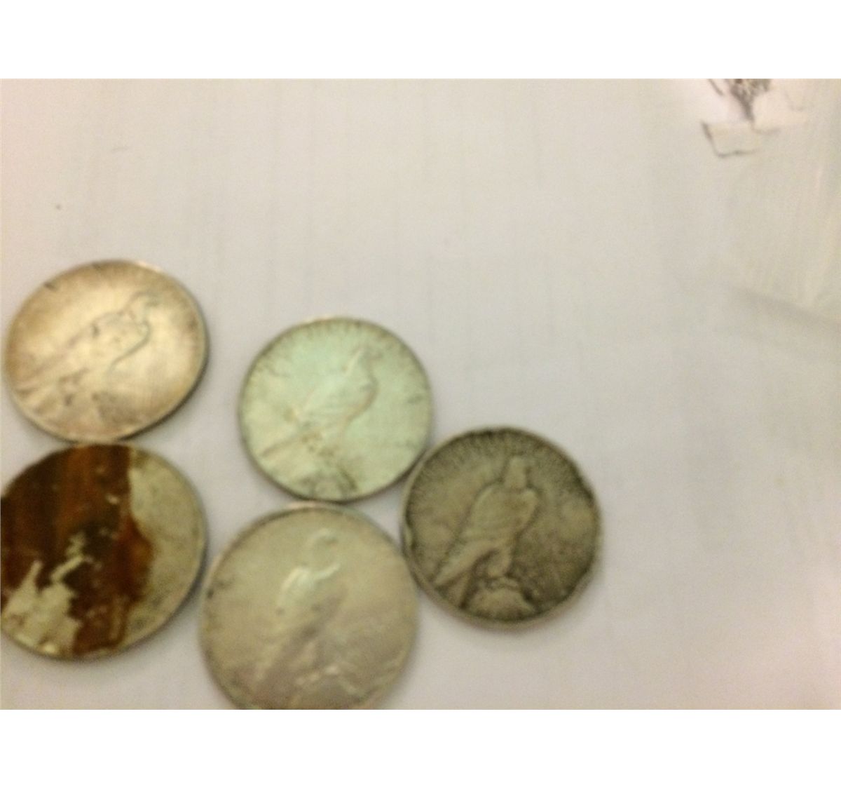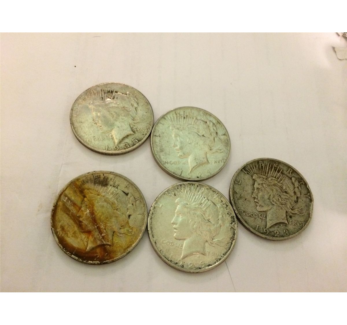 5 SILVER PEACE DOLLARS. 1922 XF, 1923-D VF, 1924 XF, 1926-S VF, 1935 VF