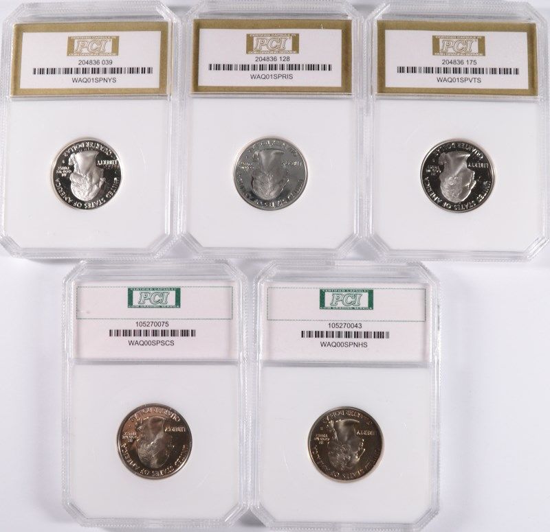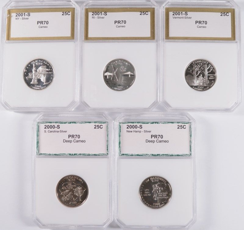 (5) SILVER PROOF SLABBED STATEHOOD QUARTERS (SC, NH, NY, RI, VT)