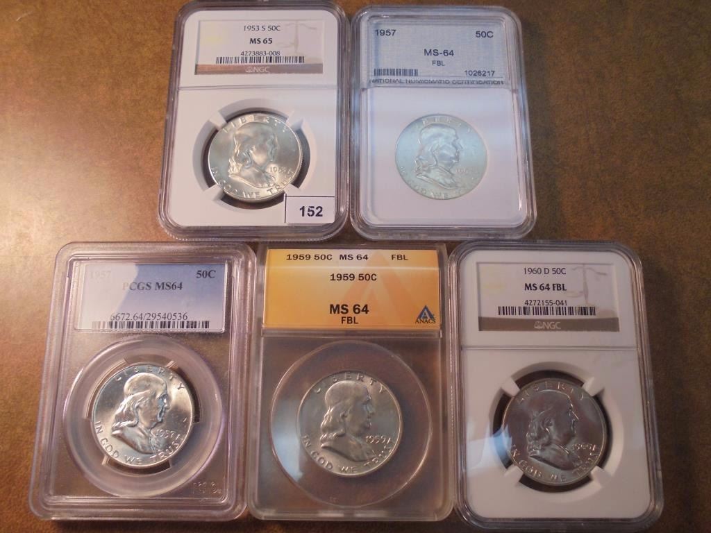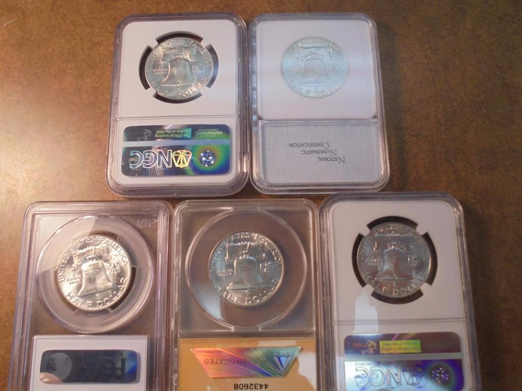 5 SLABBED FRANKLIN HALF DOLLARS SEE DESCRIPTION 1953-S NGC MS65, 1957 NNC, 1957 PCGS MS64, 1959 ANAC