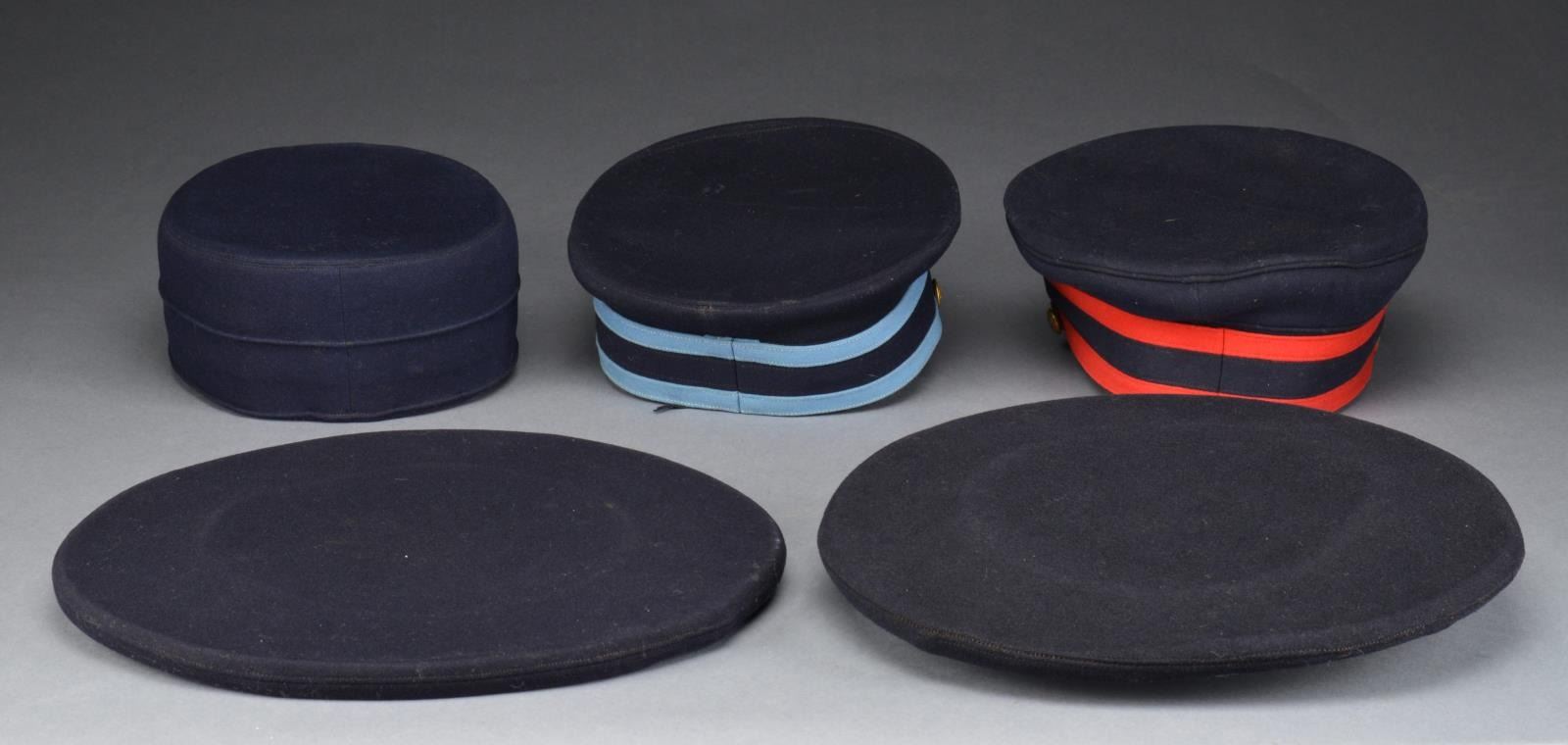 1) M1895 Enlisted forage cap w/ dark blue wool body. Cap features 2 vent holes on each side, leather chinstrap w/ eagle side buttons & a crossed rifle insignia for Company C of the 1st Infantry. Leather sweatband. Polished cotton interior lining. CONDITION: hat shows very light wear overall. 2) M1902 Army Infantry enlisted visor hat w/ a dark blue wool body. Cap features a light blue & dark blue band, leather chinstrap w/ eagle side buttons & a crossed rifle insignia on the front for Company I of the 5th Infantry. Leather sweatband. Polished cotton interior lining. CONDITION: hat shows light to moderate wear. Sweatband has a sm. tear. 3) M1902 Army Artillery enlisted visor hat w/ a dark blue wool body. Cap features a red & dark blue band, leather chinstrap w/ eagle side buttons & a crossed cannon insignia on the front for Company H of the 7th Artillery. Leather sweatband. Polished cotton interior lining. CONDITION: hat shows light to moderate wear. 4) Spanish American War to WWI era Navy enlisted flat hat w/ a cap talley that reads, “U.S.S. ELCANO”. The Elcano was a gunboat captured from the Spanish Navy during the Spanish American War. The gunboat was officially commissioned in the U.S. Navy in the year 1902. She served for many years on the Yangtze Patrol seeing significant action against various pirates & warlords. CONDITION: hat shows very light wear. Lettering on cap talley is a bit light. 5) WWI era enlisted flat hat w/ a cap talley that reads, “U.S.S. VIRGINIA”. The battleship Virginia served in the Atlantic Fleet & took part in the 1907-09 cruise of the Great White Fleet around the work. The ship was involved in the Mexican Revolution of 1913-14 including the occupation of Veracruz, Mexico. She also served as a training ship & a convoy escort during WWI. CONDITION: hat shows light wear overall. Lettering on cap talley is a bit light. (02-14157/BF). $600-800.