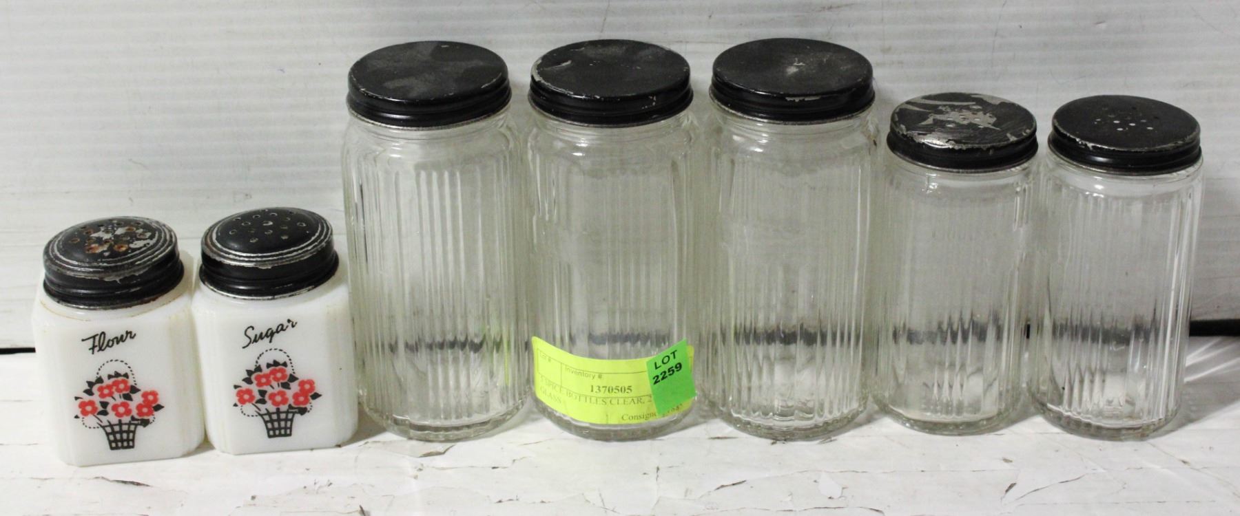 5 SPICE BOTTLES CLEAR, 2 MILK GLASS.