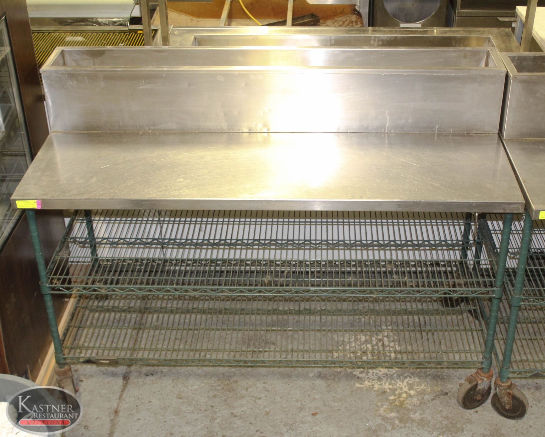 60" X 30" STEEL TOP W/ INSERT WELL, WELDED TO GREEN WIRE BASE W/ CASTERS, 2 UNDERSHELVES(24" WIDE). PREP AREA: 60" X 17.5", 60" INSERT WELL W/ DRAINAGE.