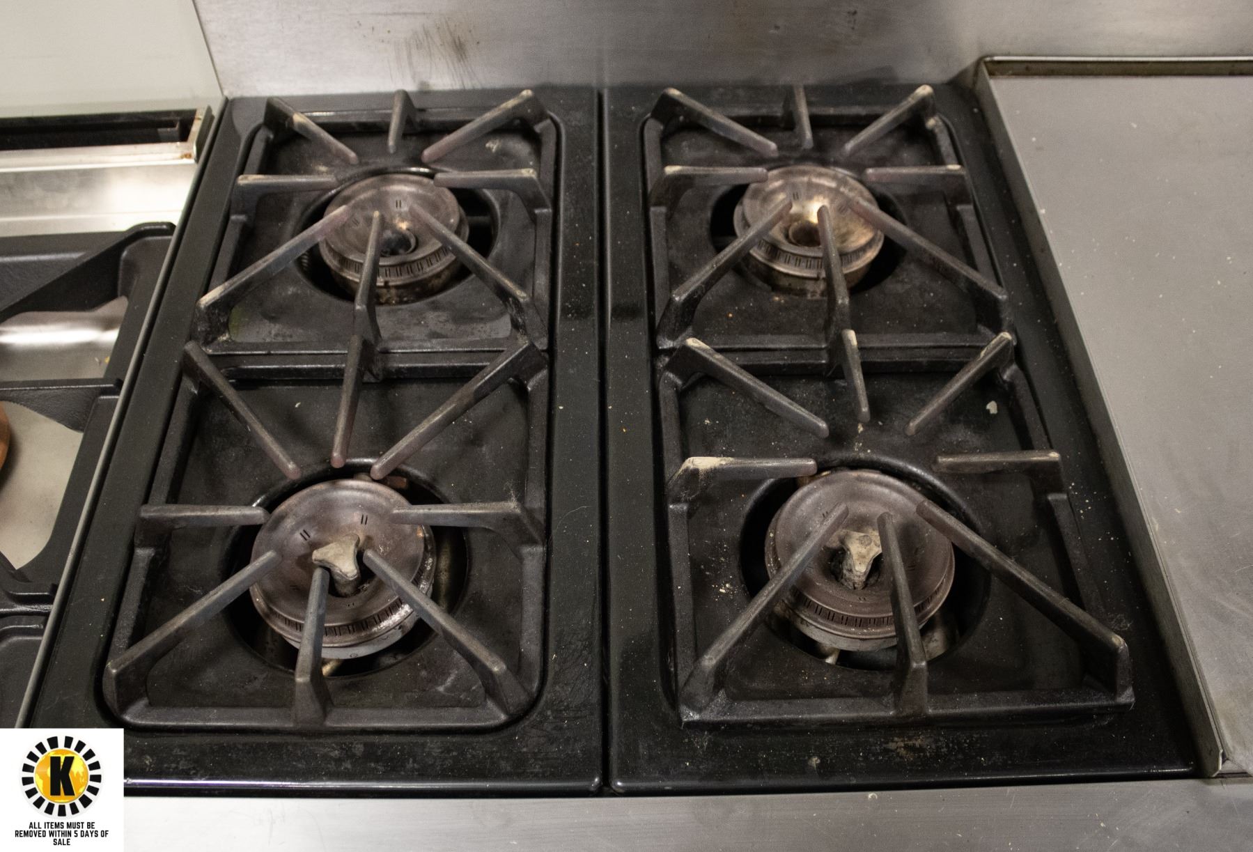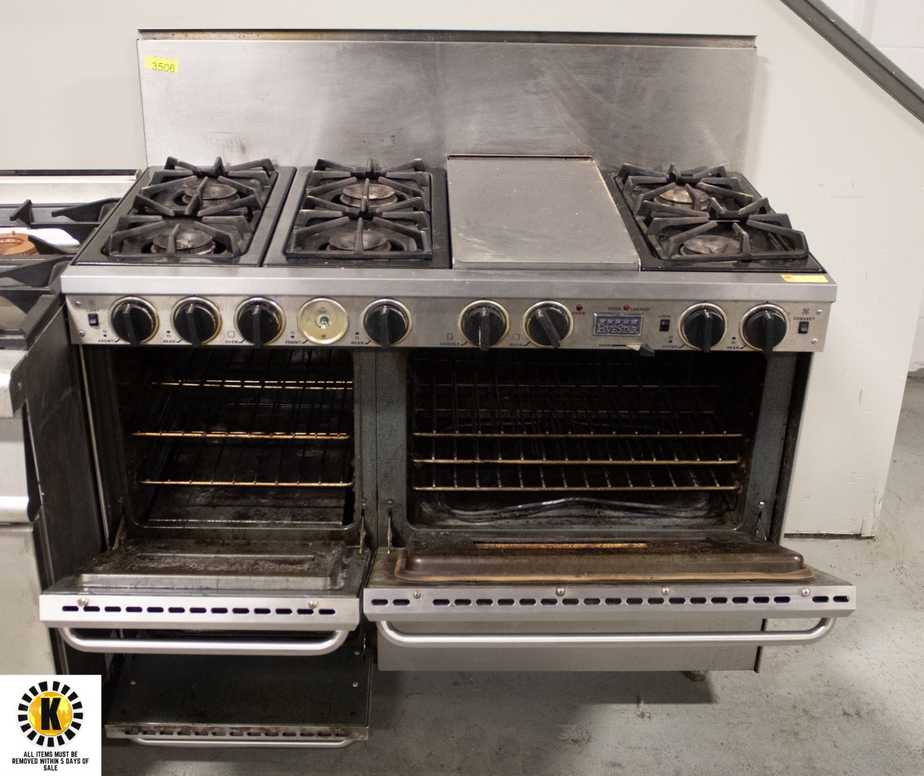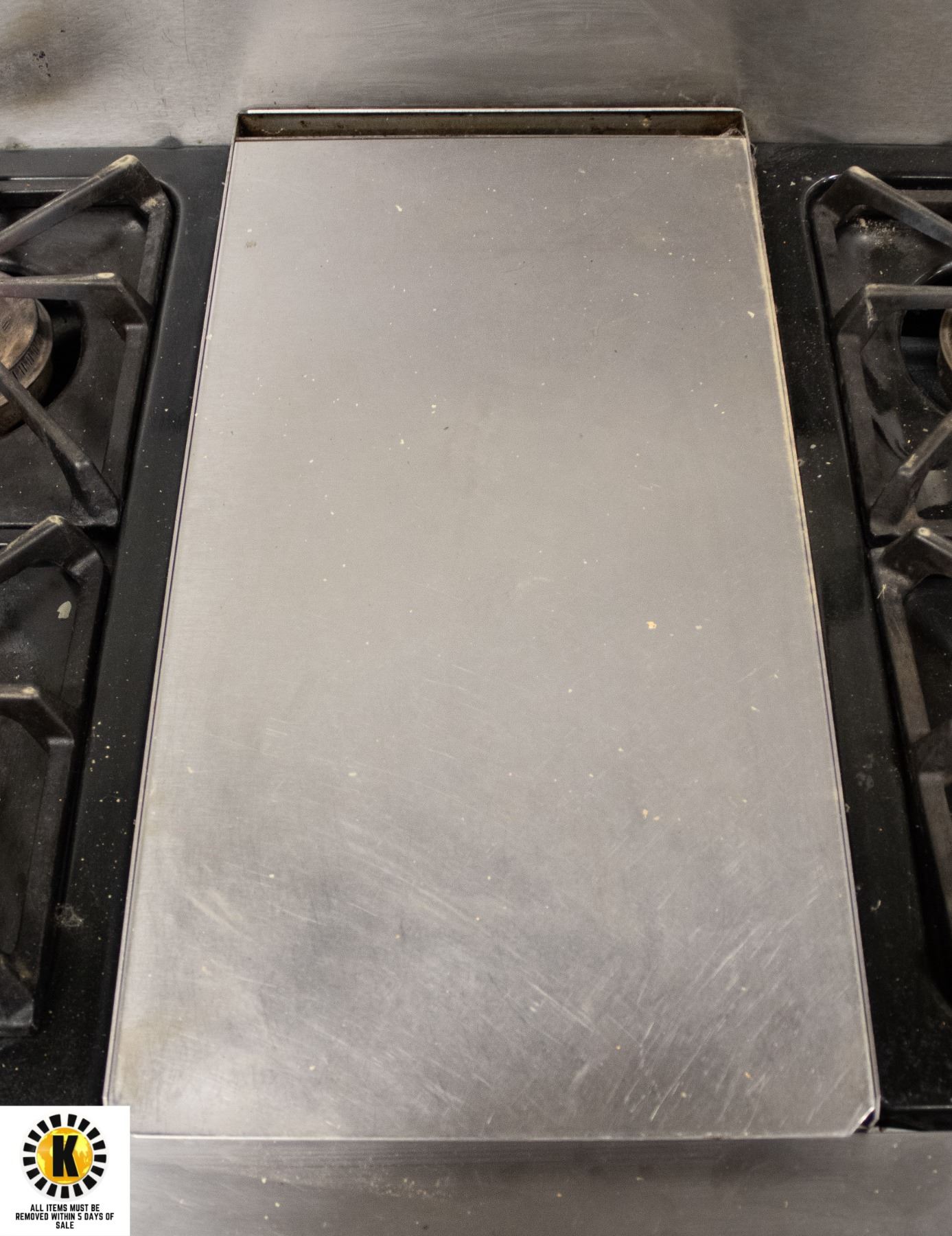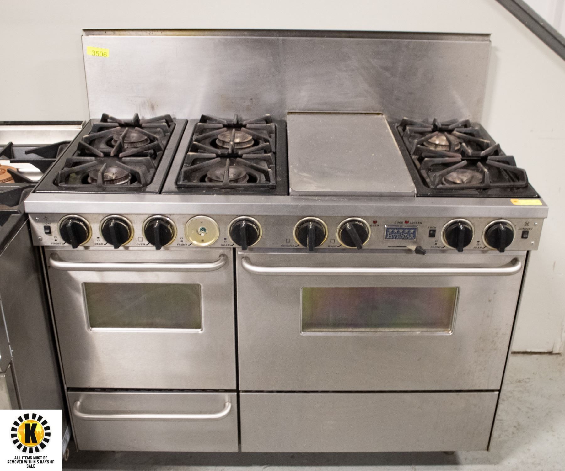 W/ GRIDDLE INFO PANEL IS MISSING, MISSING ONE BURNER KNOB, INTERIOR OVEN GLASS ON RIGHT HAND SIDE IS BROKEN APPROX 48"X26"X47"