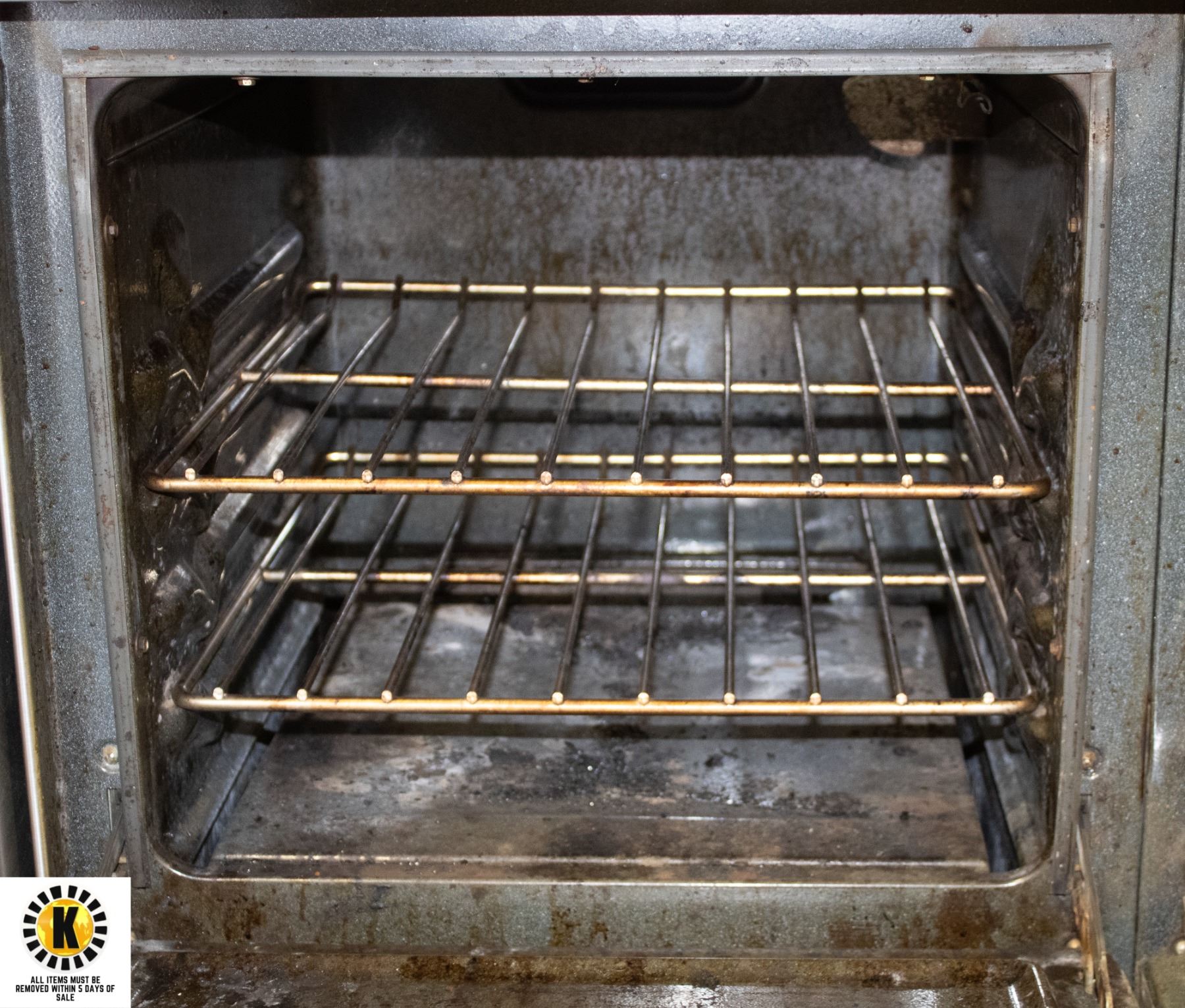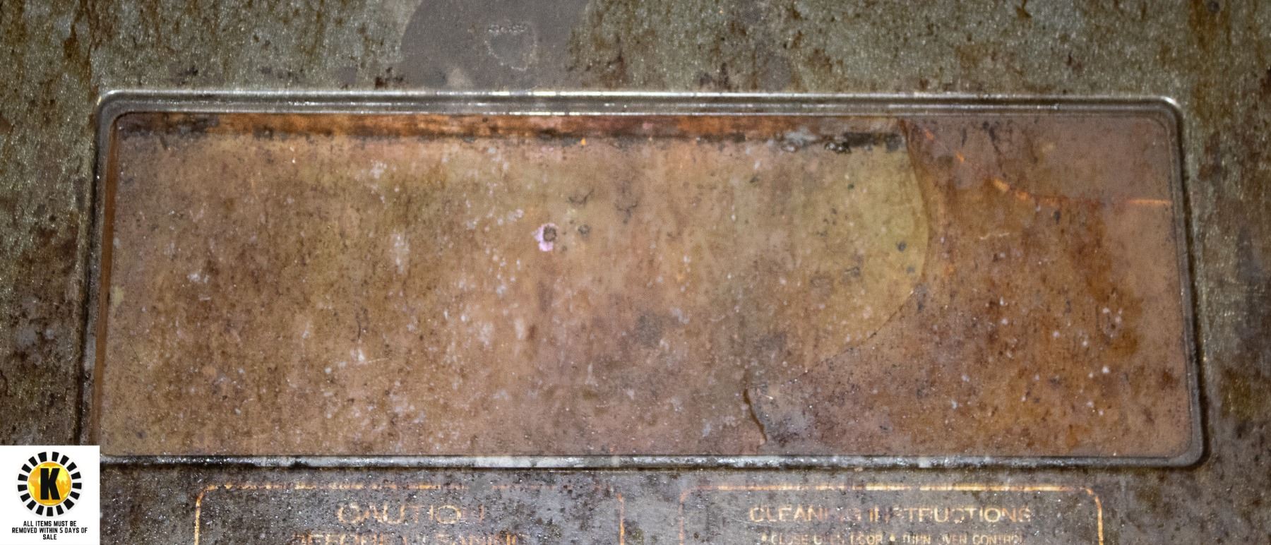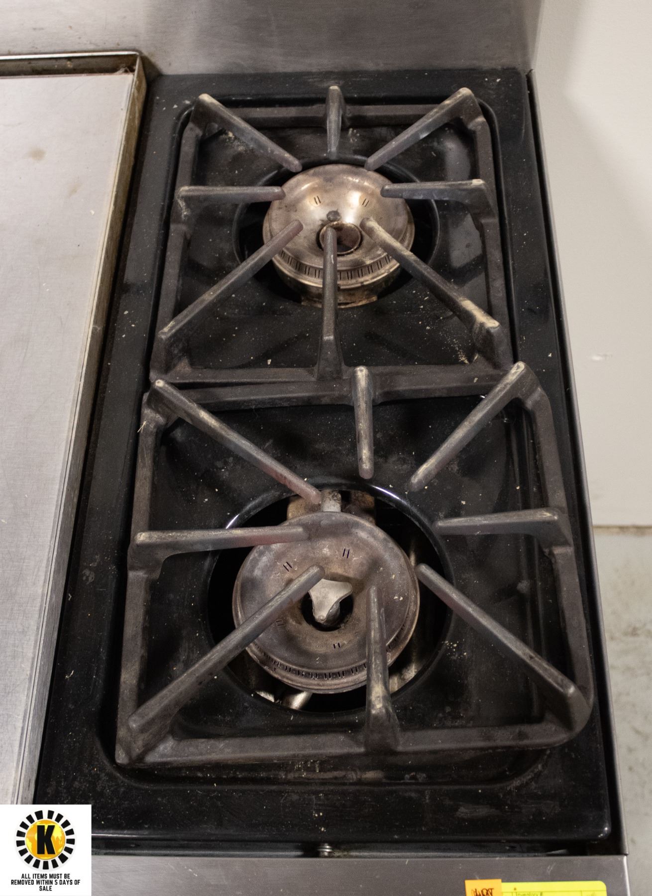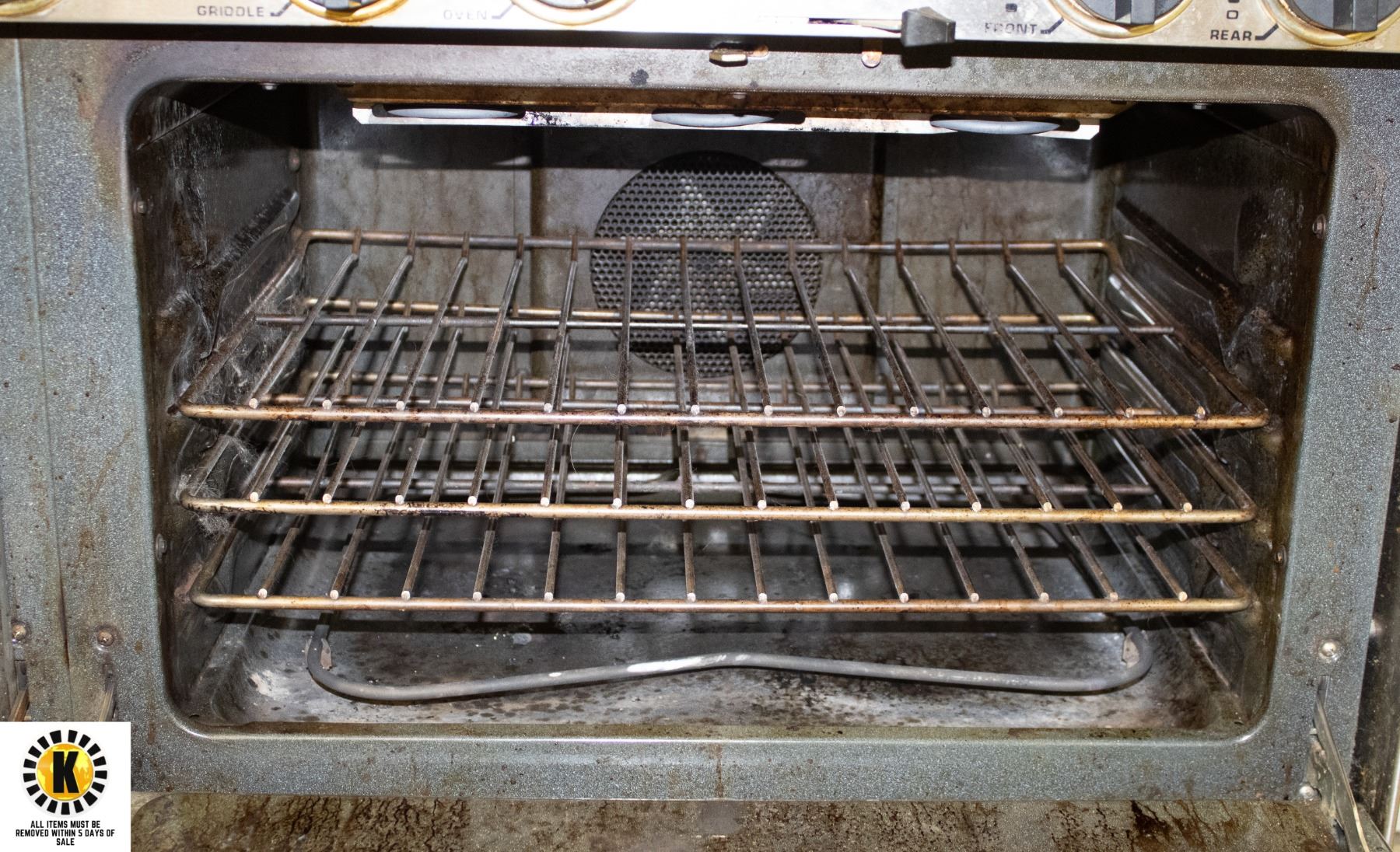 W/ GRIDDLE INFO PANEL IS MISSING, MISSING ONE BURNER KNOB, INTERIOR OVEN GLASS ON RIGHT HAND SIDE IS BROKEN APPROX 48"X26"X47"