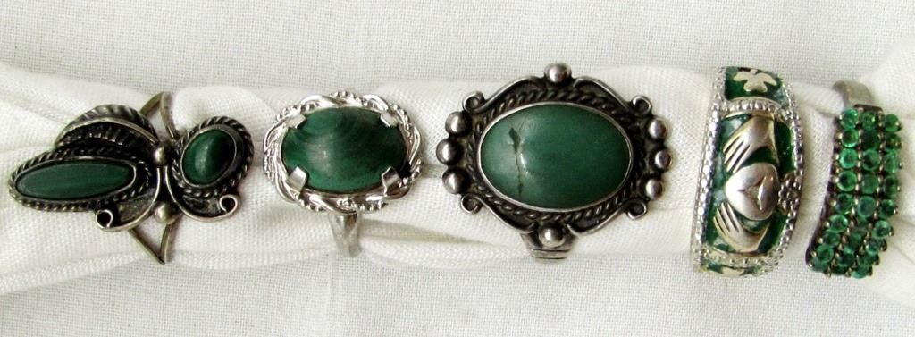 POSSIBLE EMRALD STONE ACCENTS! SOME MARKED. VARIOUS SIZES 4-8. TOTAL 16.7 DWT
