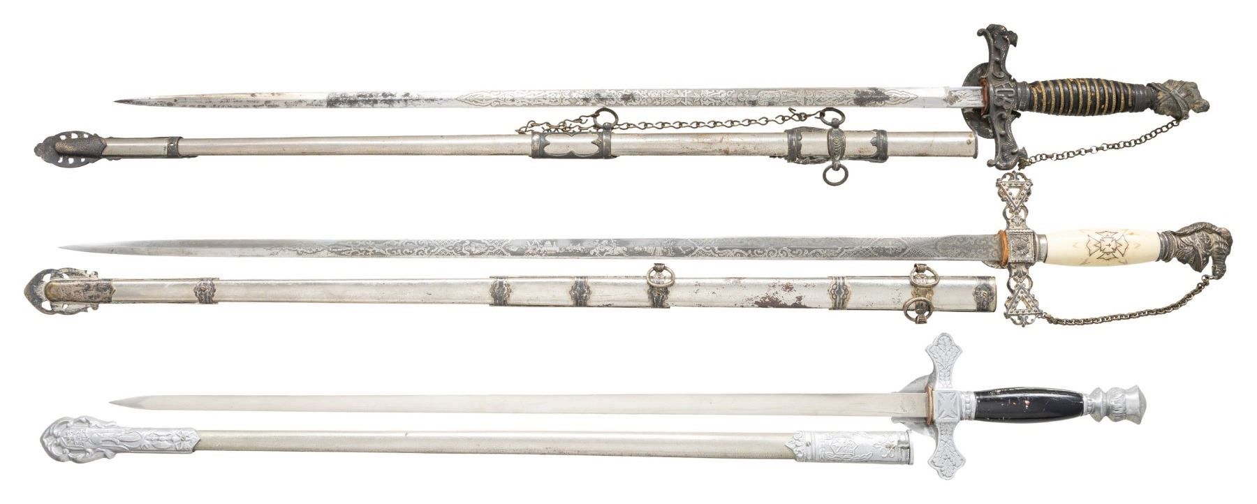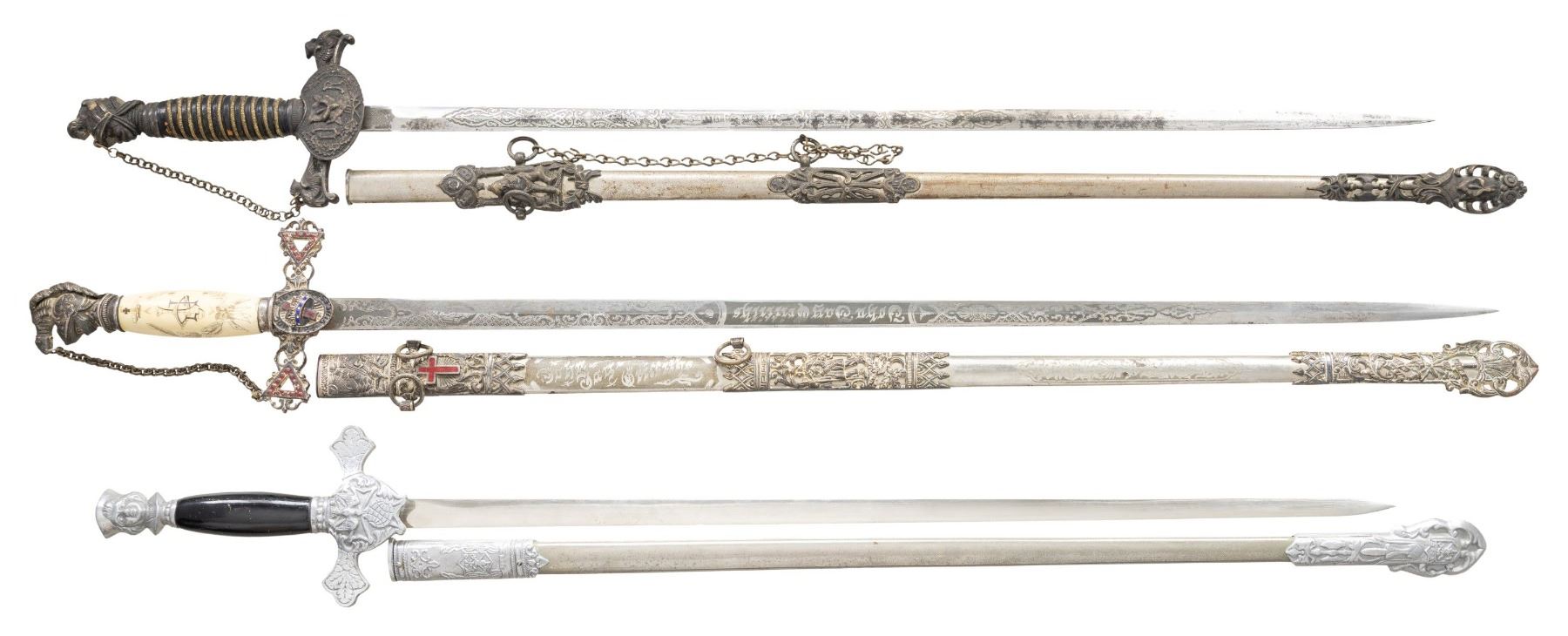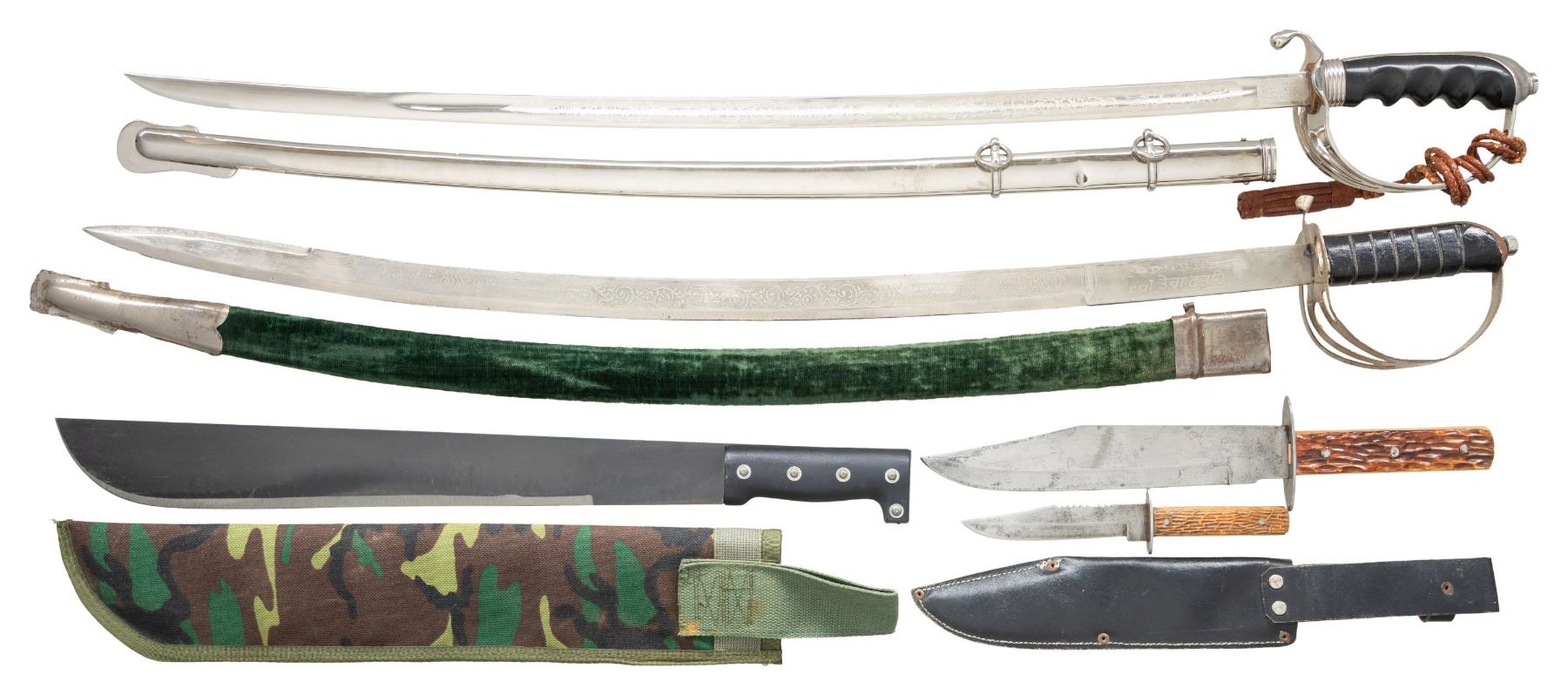 This lot of edged weapons includes 1 US M1903 saber for all offices dating from 1931 to 1953 with an etched blade, leather knot and original scabbard. / 1 Knights of Pythias sword with an etched blade and original scabbard. / 1 Knights Templar sword with an etched blade and original scabbard. / 1 Knights of Columbus sword with a plain blade and original scabbard. / 1 Tourist souvenir saber made in India with an etched blade and green velvet scabbard. / 1 Modern machete with a nylon camouflage scabbard. 1 Moderm belt knife set containing a 15" clipped point bowie knife and an 8 1/2" clipped point bowie knife in the same black leather sheath. CONDITION: all edged weapons show light overall wear with no notable damage. (02-24168/BF). NON-GUN. $500-700.