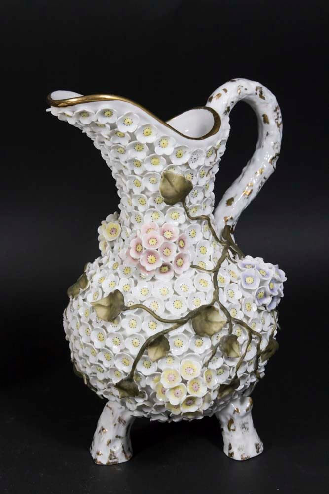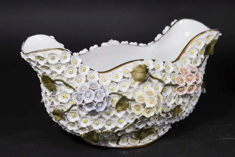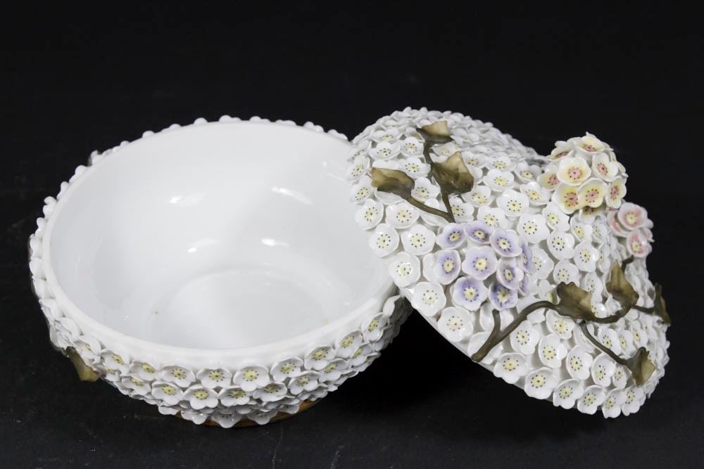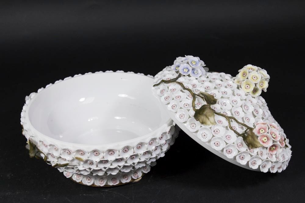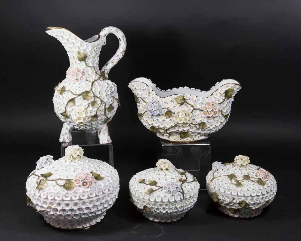 Including 3 covered bowls, boat, and pitcher. Largest approx. 11 1/4" H. From an Edgewater, NJ estate. Light chips throughout.