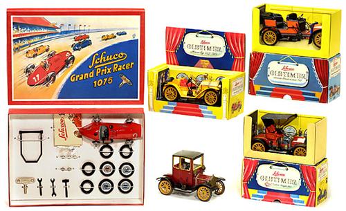 5 "Schuco Oldtimer", c. 1970 With 4 clockwork driven oldtimer cars (Opel, no. 1228, Ford T, no. 1227, Mercer, no. 1225, Mercedes, no. 1239) and "Grand Prix" construction kit (replica) no. 1075.<Br>