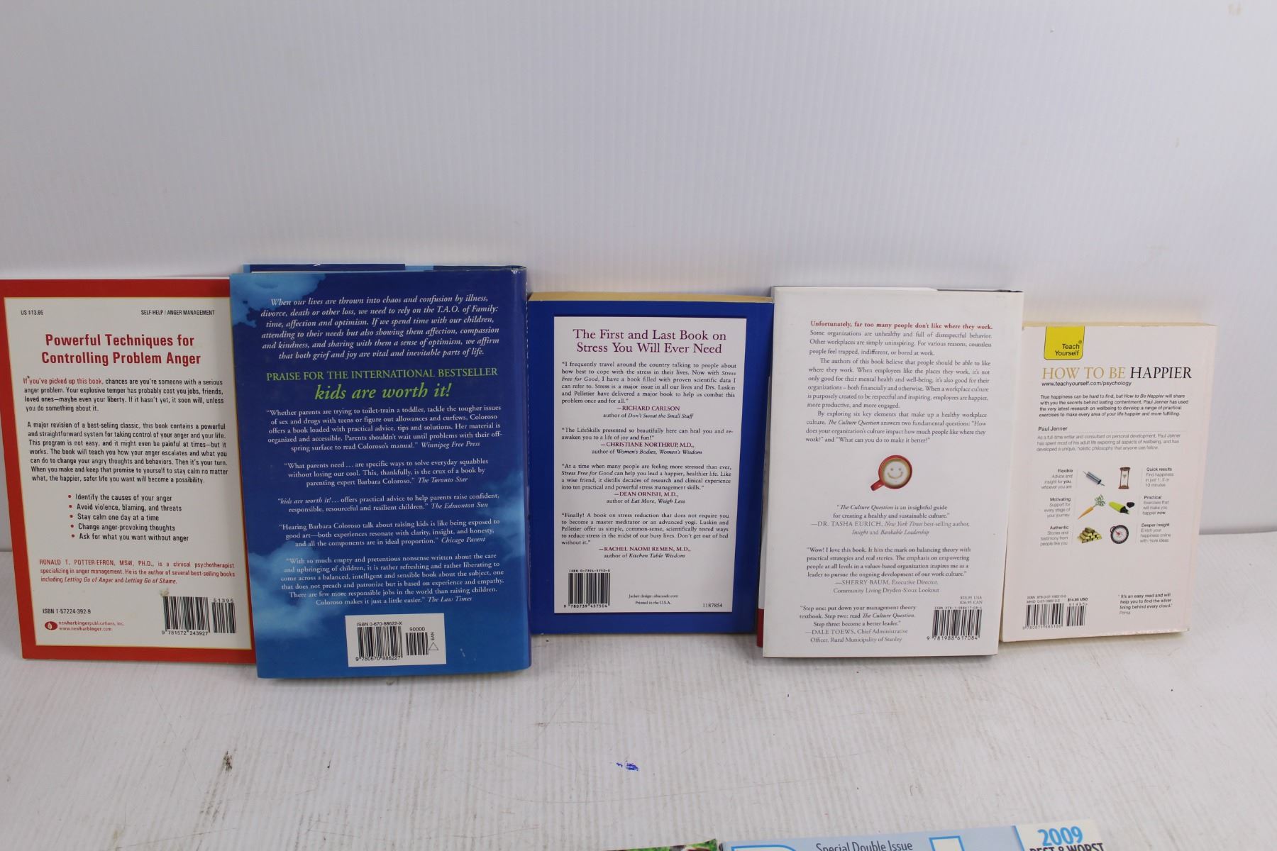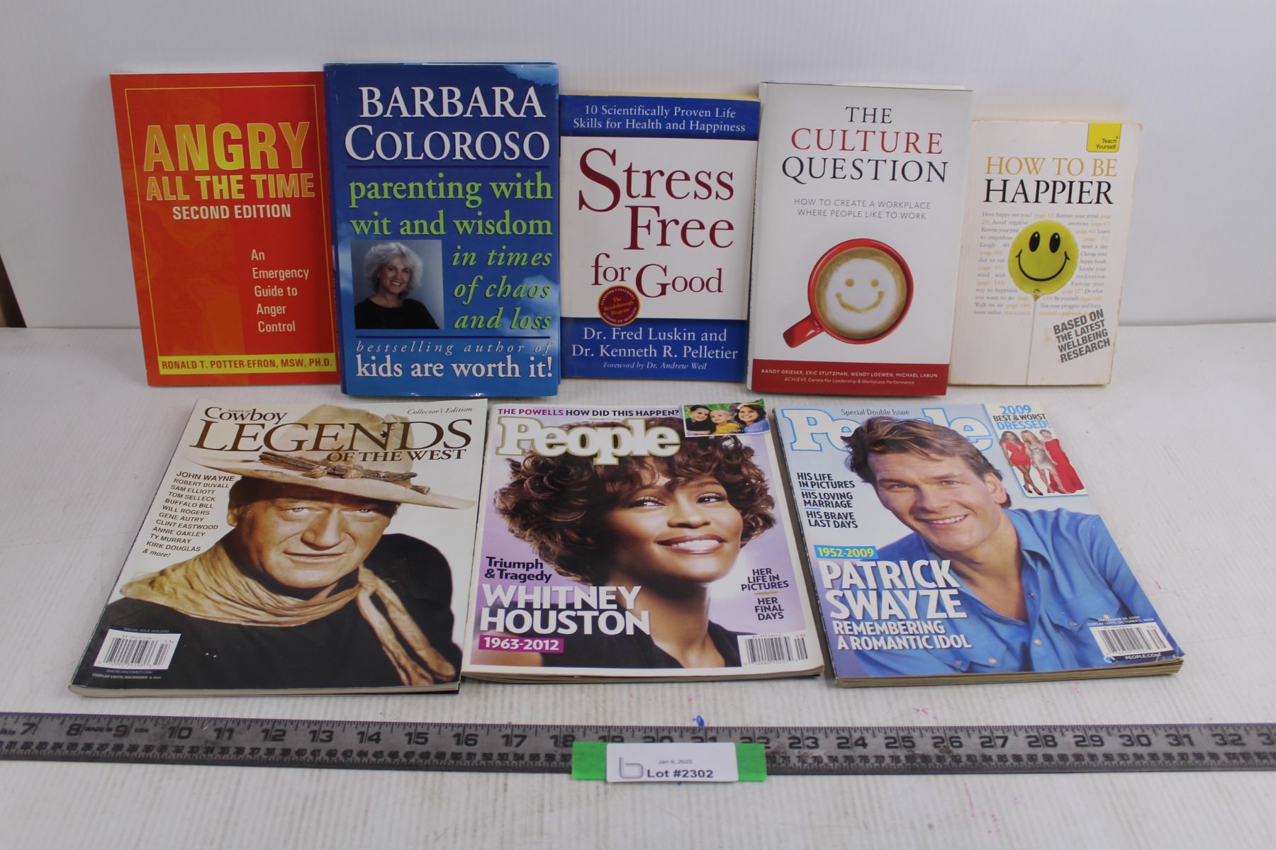 (5) Self Help Books (How To Be Happier, Stress Free For Good, Angry All The Time), (3) Magazines (People, Cowboy Legends)