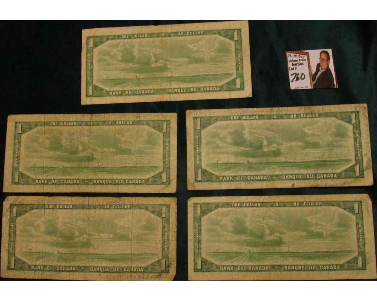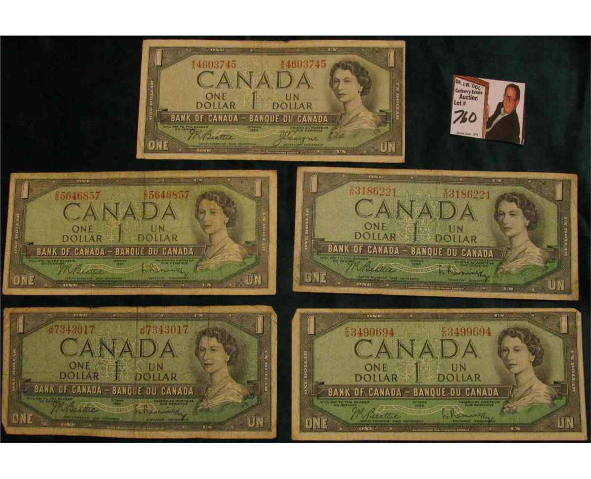 (5) Series 1954 Bank of Canada $1 Banknotes. Circulated.