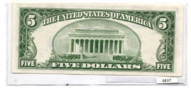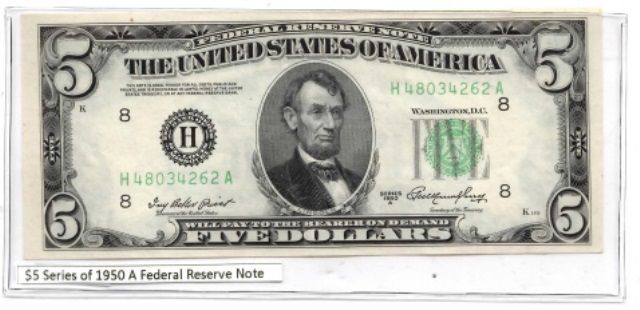 $5 Series of 1950 A Federal Reserve Note From the Federal Reserve Bank of St. Louis Missouri. Beautiful note in Almost Uncirculated condition one center fold. Signatures of Priest and Humphrey F-1962H