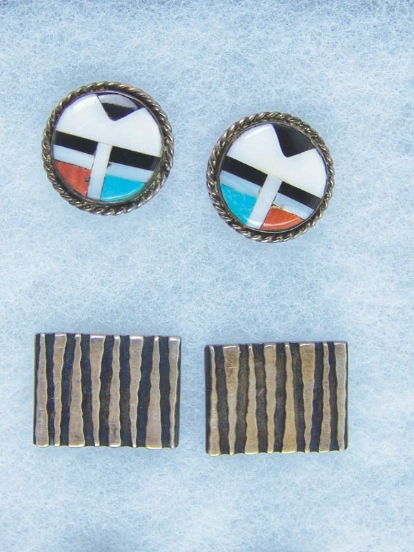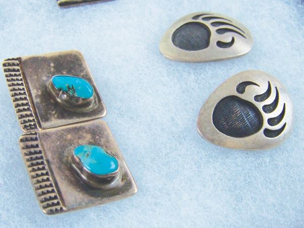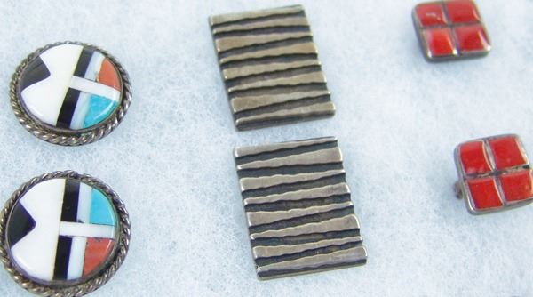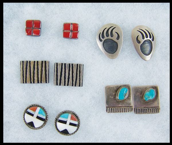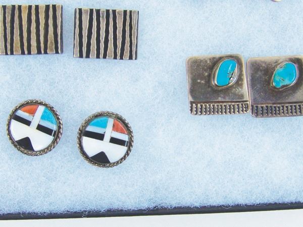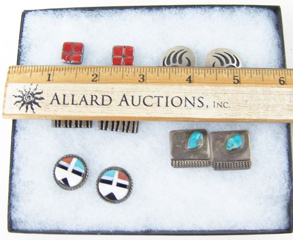 Group of five all silver cufflinks including Zuni inlay, Navajo, and Hopi overlay examples. Very good condition.Mid/Late 1900sLargest 3/4"