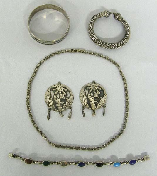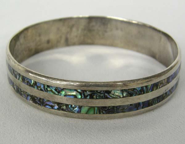 5 Silver Stone and Abalone Bracelets Earrings and Chain. 3 Bracelets, 1 Pair Earrings, 1 Chain. Most is Mexican and 1 Bracelet is Asian. Chain measures approx. 19''L. SHI $15.