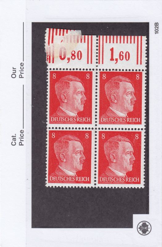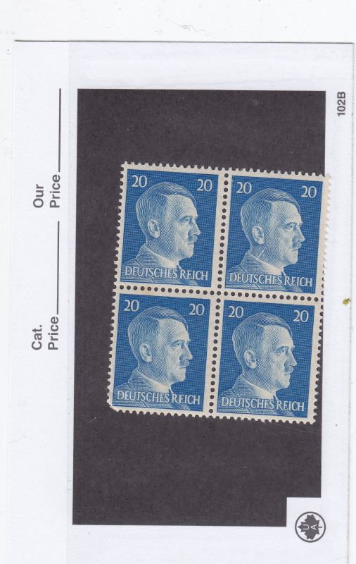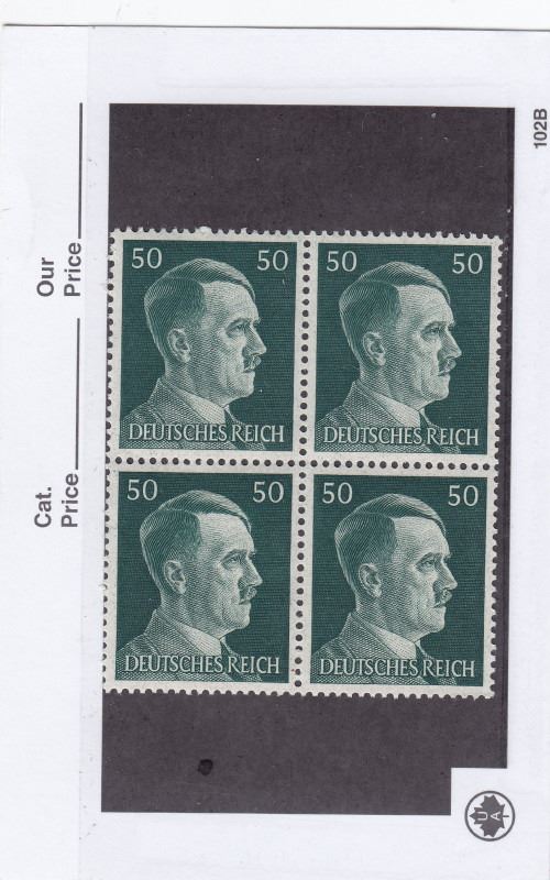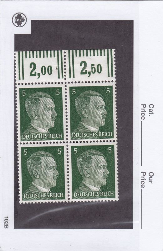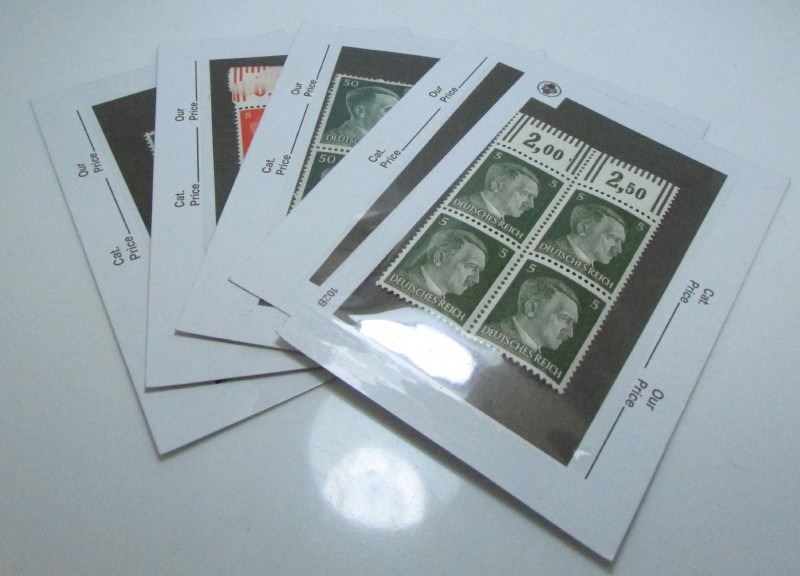5 Cards of German Hitler Postage Stamps - All Unused - .80 Reich, 20 Reich, 50 Reich, 1 Reich, 2 Reich
