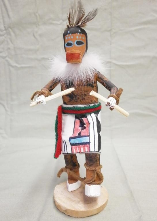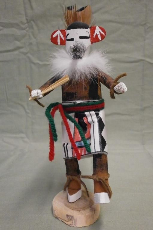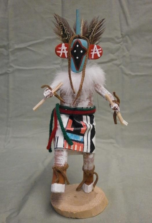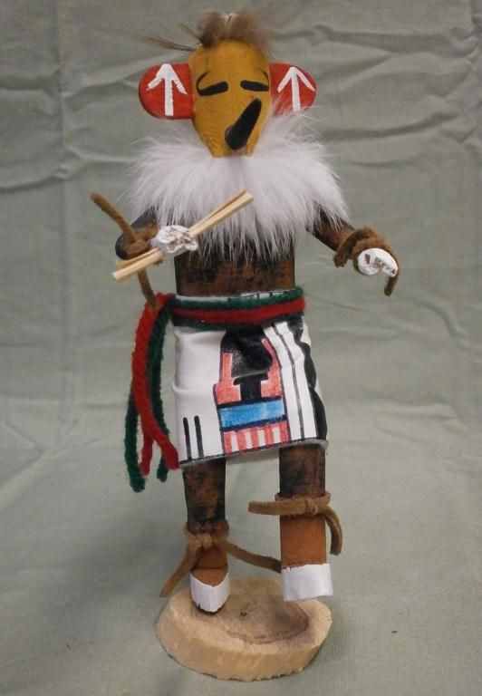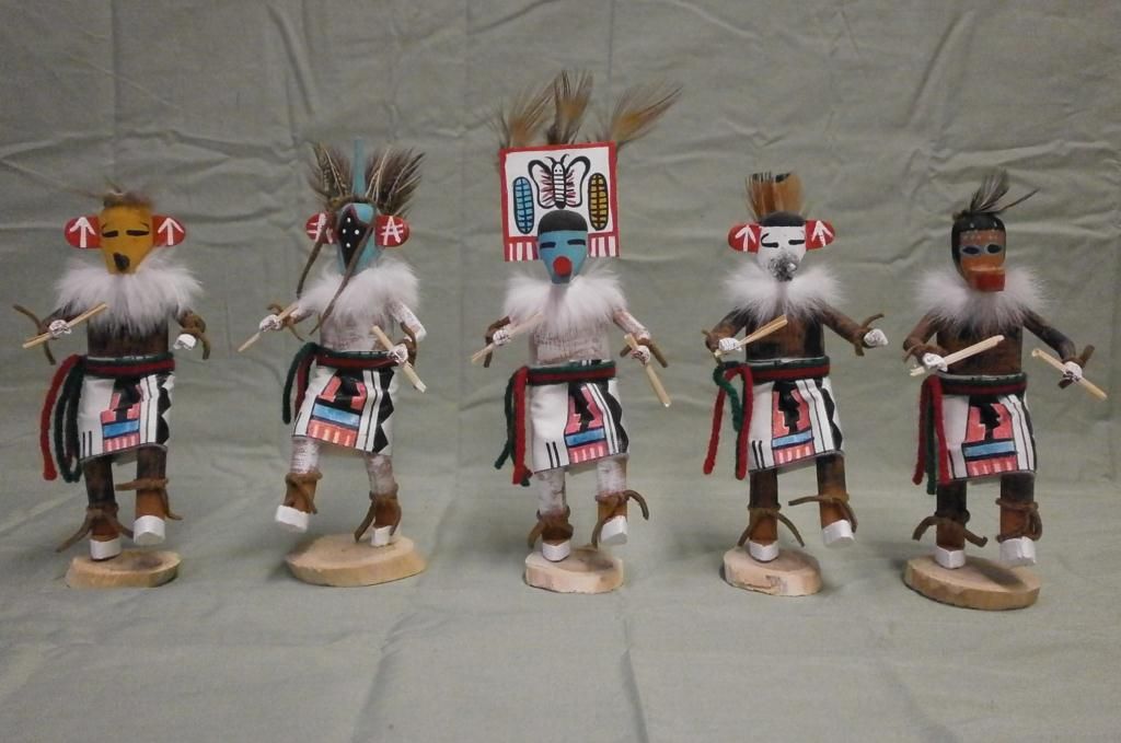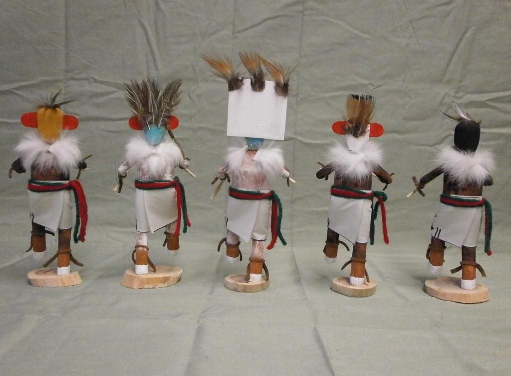All hand painted and hand crafted. With simulated leather skirts & yarn sashes. Also with leather, feather and fur decorations in various locations. All from about 6-1/2" to 8" tall. All signed and titled by the artist.