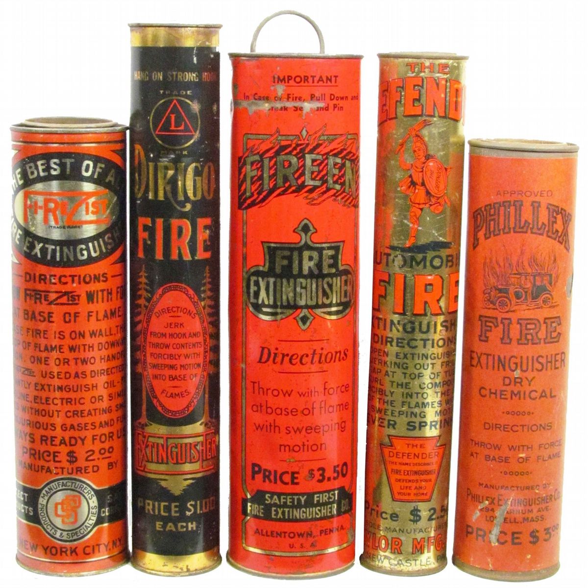 Collection of 5 Small Tin Tube Fire Extinguishers including Fireen, Dirigo, FireZist, Phillix and Defender. Various sizes and conditions.