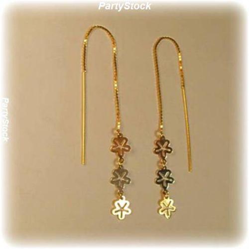 5 inch, solid 14K Gold (Rose, White & Yellow) adjustable "Threader" earrings are adjustable! Can be worn at lengths from 2.5 to 3.5 inches long. They hang in front of AND BEHIND the earlobe for a sexy, different look. This pair has 3 Flower pendants dropping from the chain: a white gold, yellow gold and white gold one. Exquisite and versatile!
