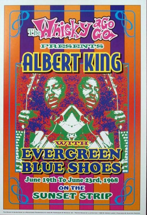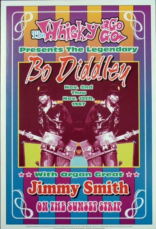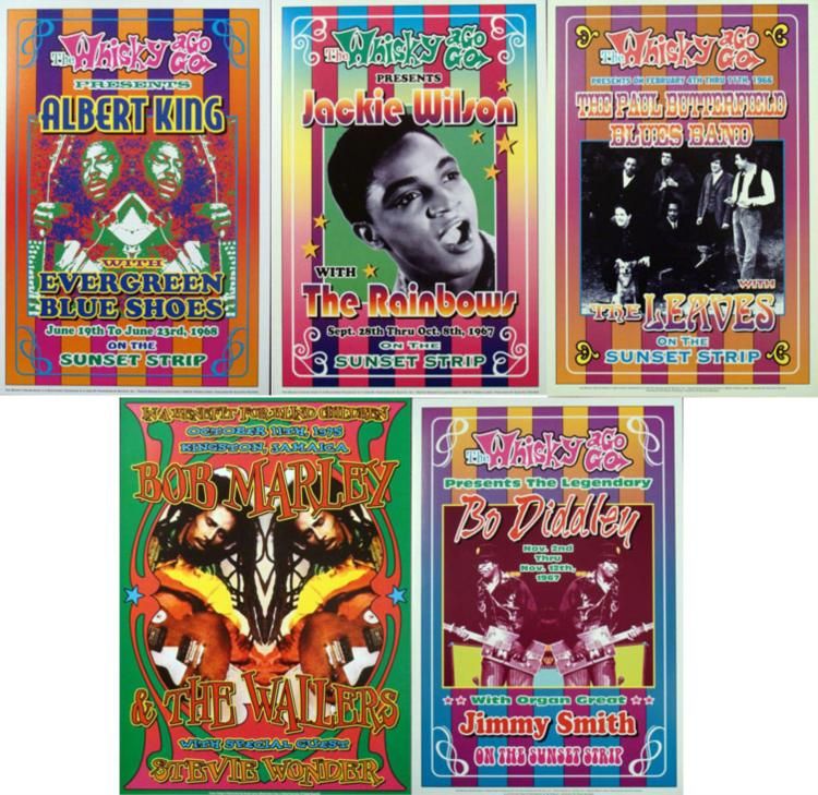 This is a group of 5 reproductions of original concert posters, four from The Whisky a Go Go in Los Angeles, and one from Jamaica, featuring some soul, blues and reggae greats. * Size: 13 1/2" x 20" (approximately) Medium: Heavy Poster Stock Condition: Excellent The artists include: Paul Butterfield Blues Band, 1966 Bo Diddley, 1967 Albert King, 1968Jackie Wilson, 1967 Bob Marley, 1975Please note: These are reproductions printed in 1999, not original concert posters *