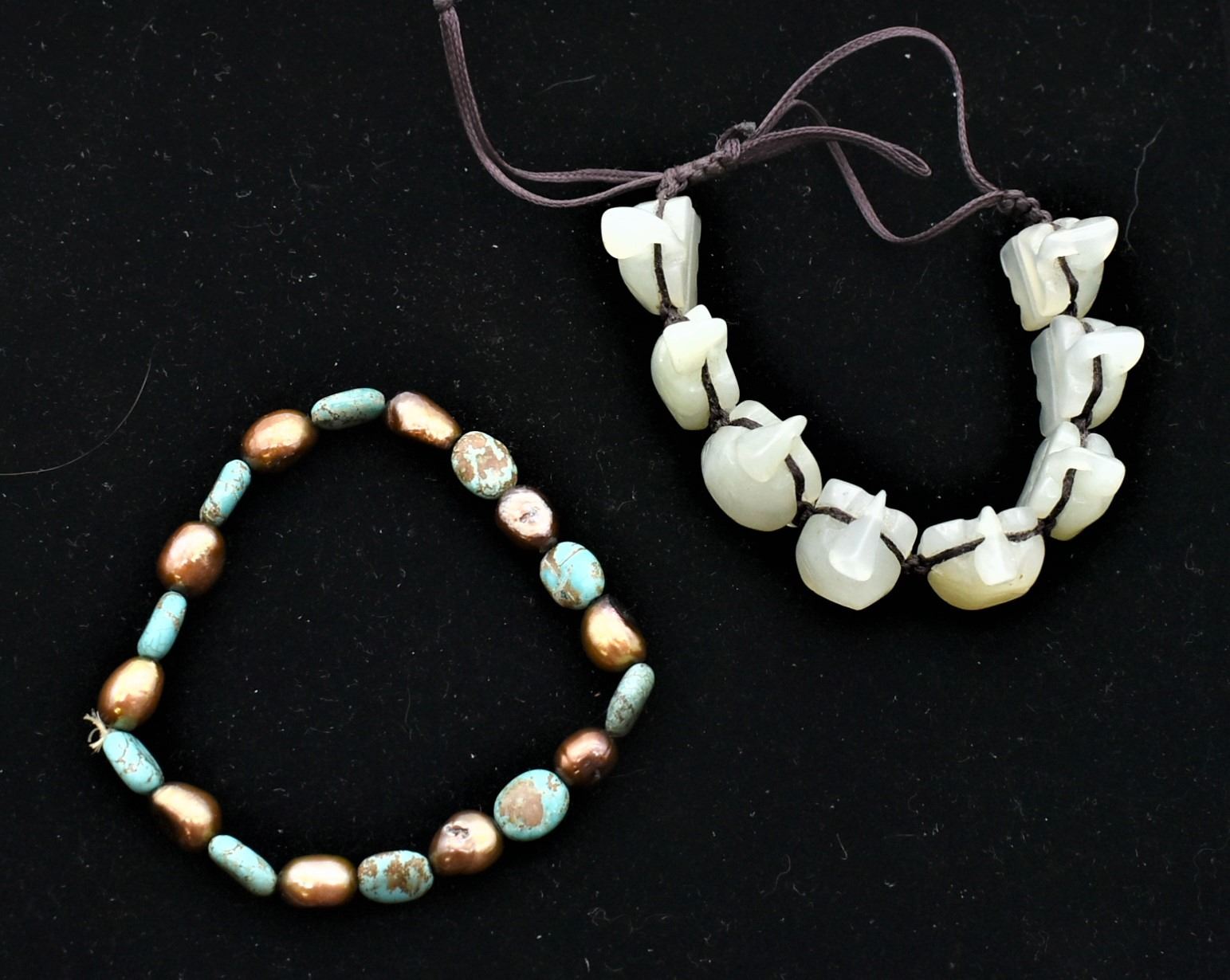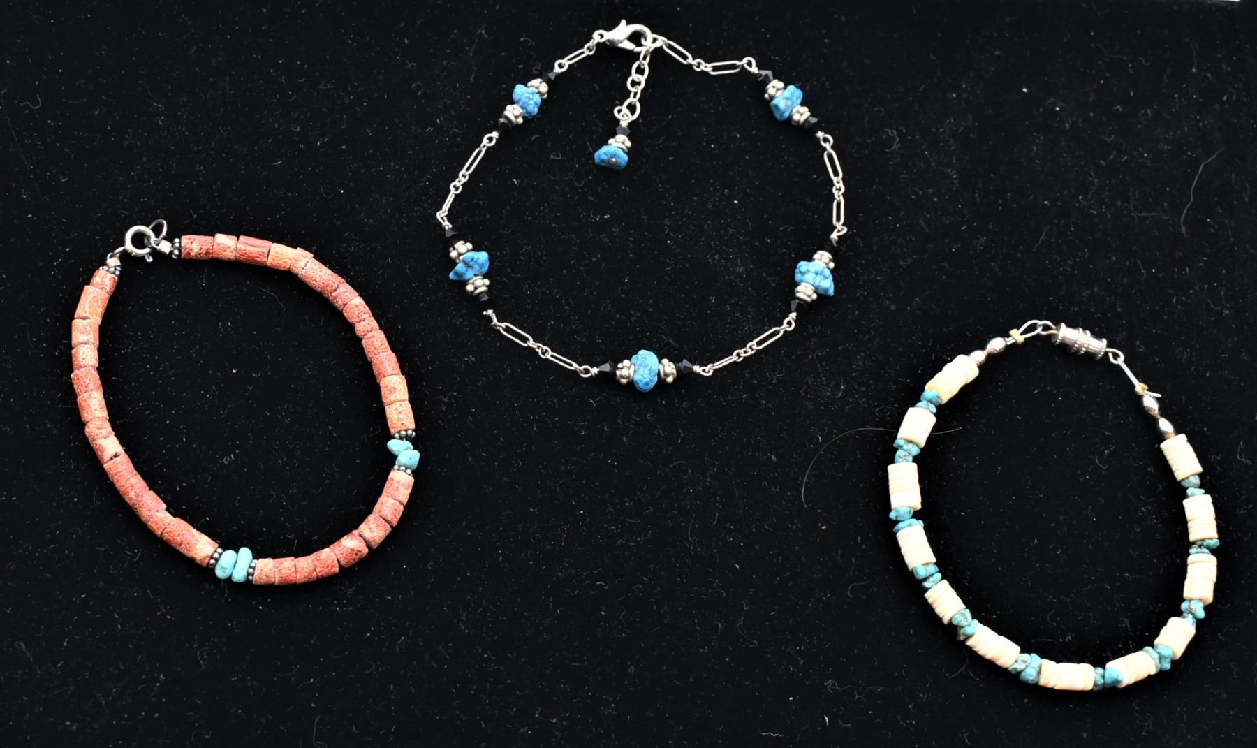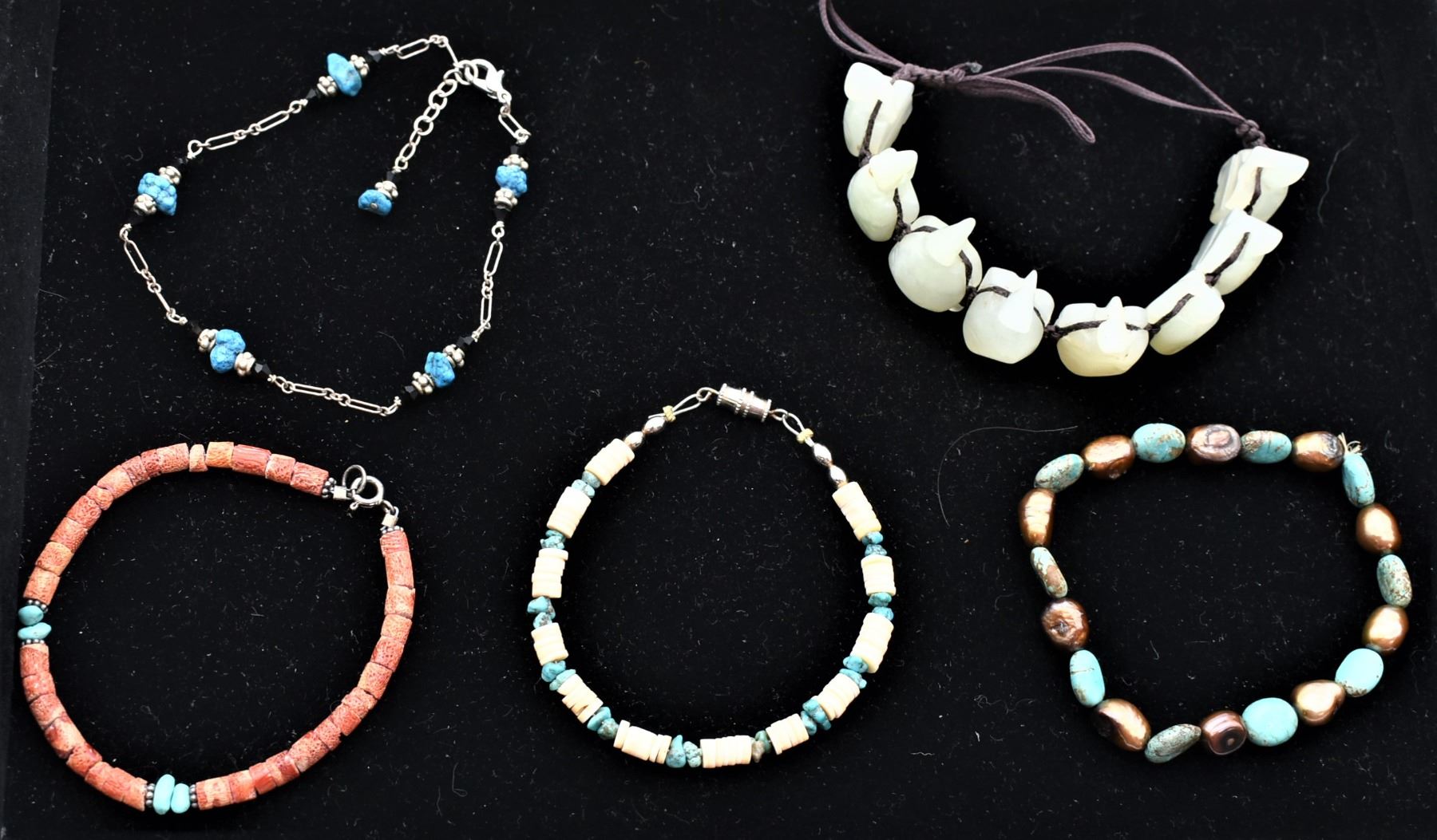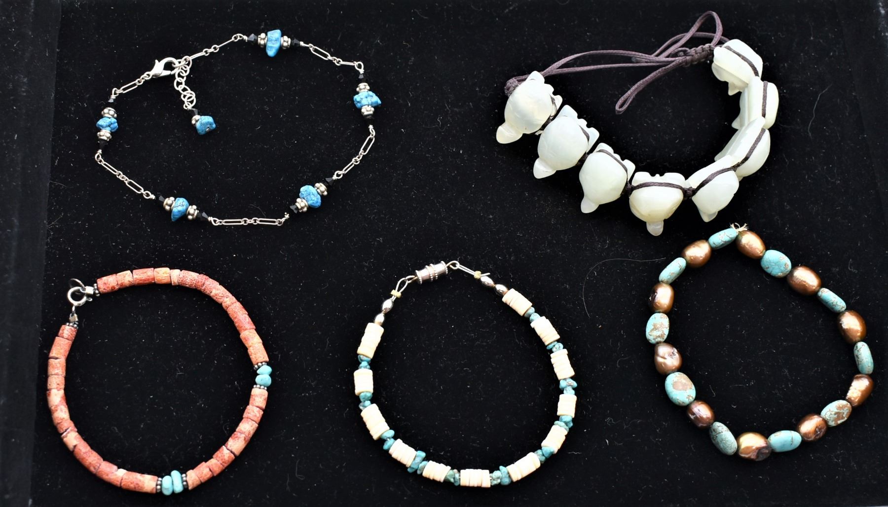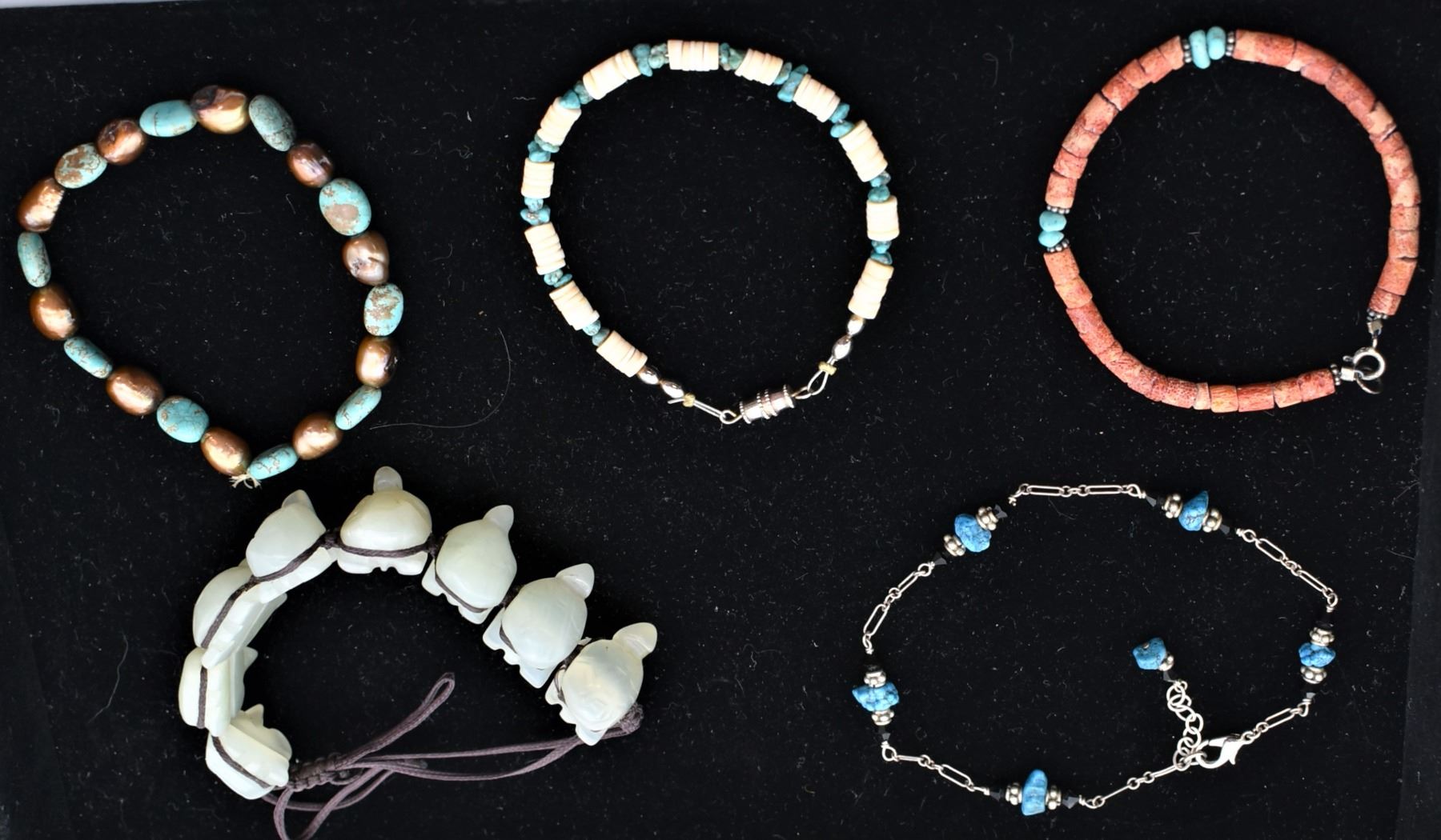 5 Southwestern and Ethnic Bracelets, includes coral, turquoise nuggets, shell heishi, carved jade turtles, 1 is an elastic stretch bracelet, measure 6''L to 7''L