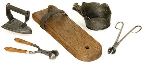 5 Spezial-Bügeleisen, vor 1900 1) Knopflocheisen (Pflaumeneisen), Länge 24 cm. - 2) Knopflocheisen mit Holzgriffen, Länge 21 cm. - 3) Wandbrett als Halterung für Bügeleisen, Höhe 37 cm. - Und: 4) Chinesische Bügelpfanne, Ø 12 cm. - Sowie: 5) Glanzbügeleisen "Silvesters Patent-Salter", Länge 12 cm.