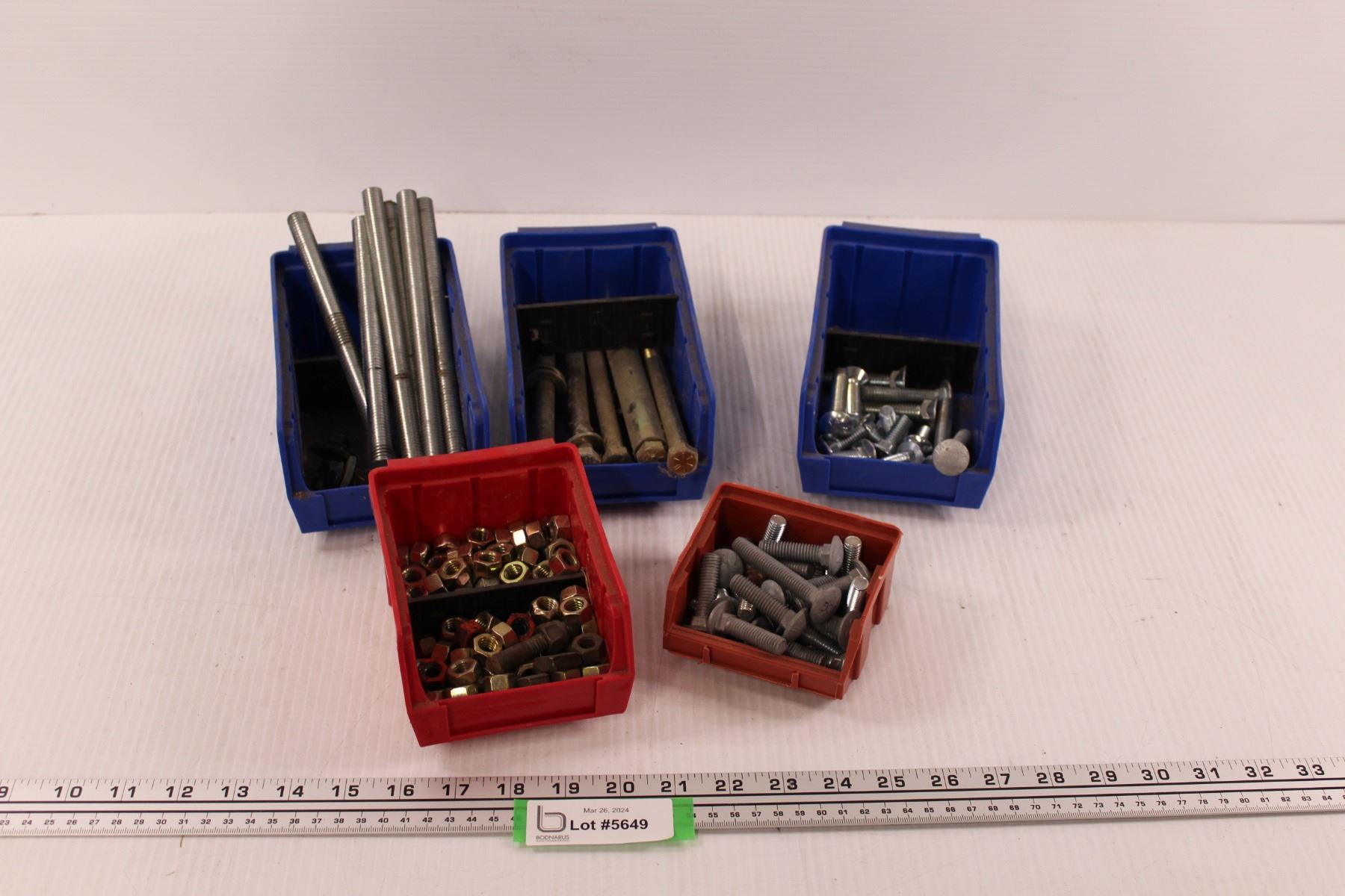 (5) Stackable Hardware Bins w/Bolts, Nuts & Ready Rod