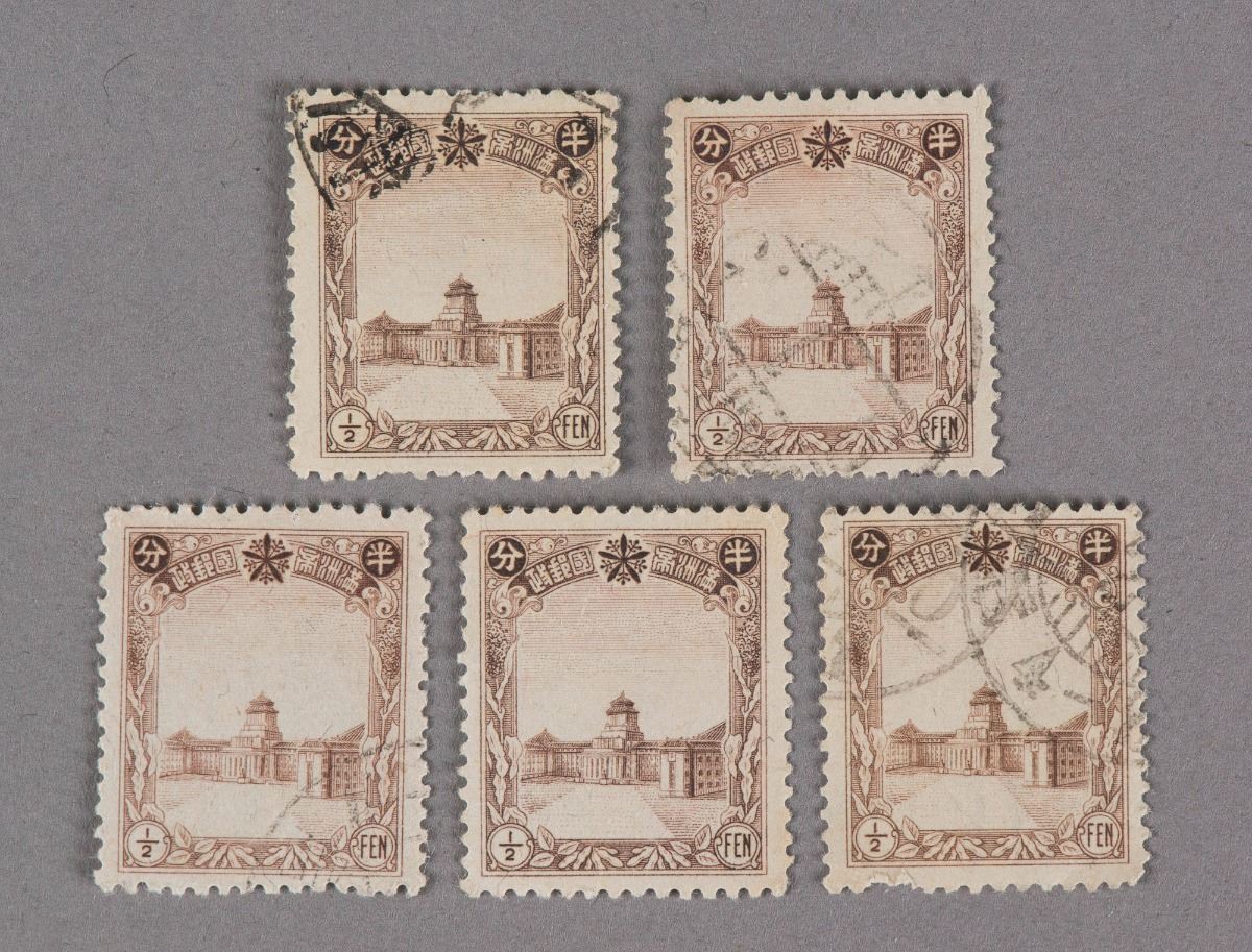 Five "half cent" Chinese stamps, Man Ord.5 4th Print Ordinary Issue, with postmarks, 1936.12.5 - 1937.4.1; 18.5 mm x 22.5 mm; Provenance: private Canadian collector