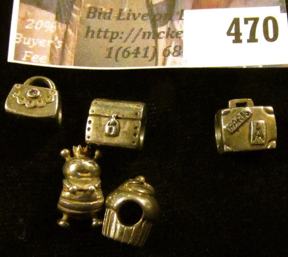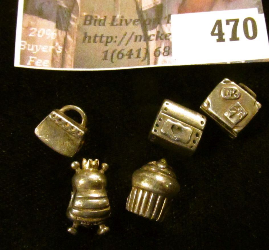 (5) Sterling Pandora charms – a purse, a suitcase, a steamer trunk chest, a cupcake, and a queen bee