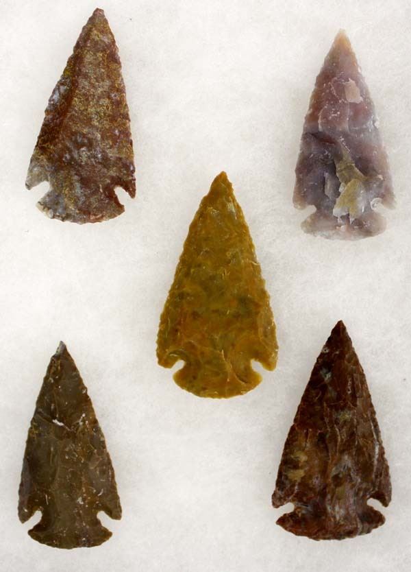 5 Stone Arrowheads, longest measures 1'' x 2'', age and origin unknown, have not be tested.