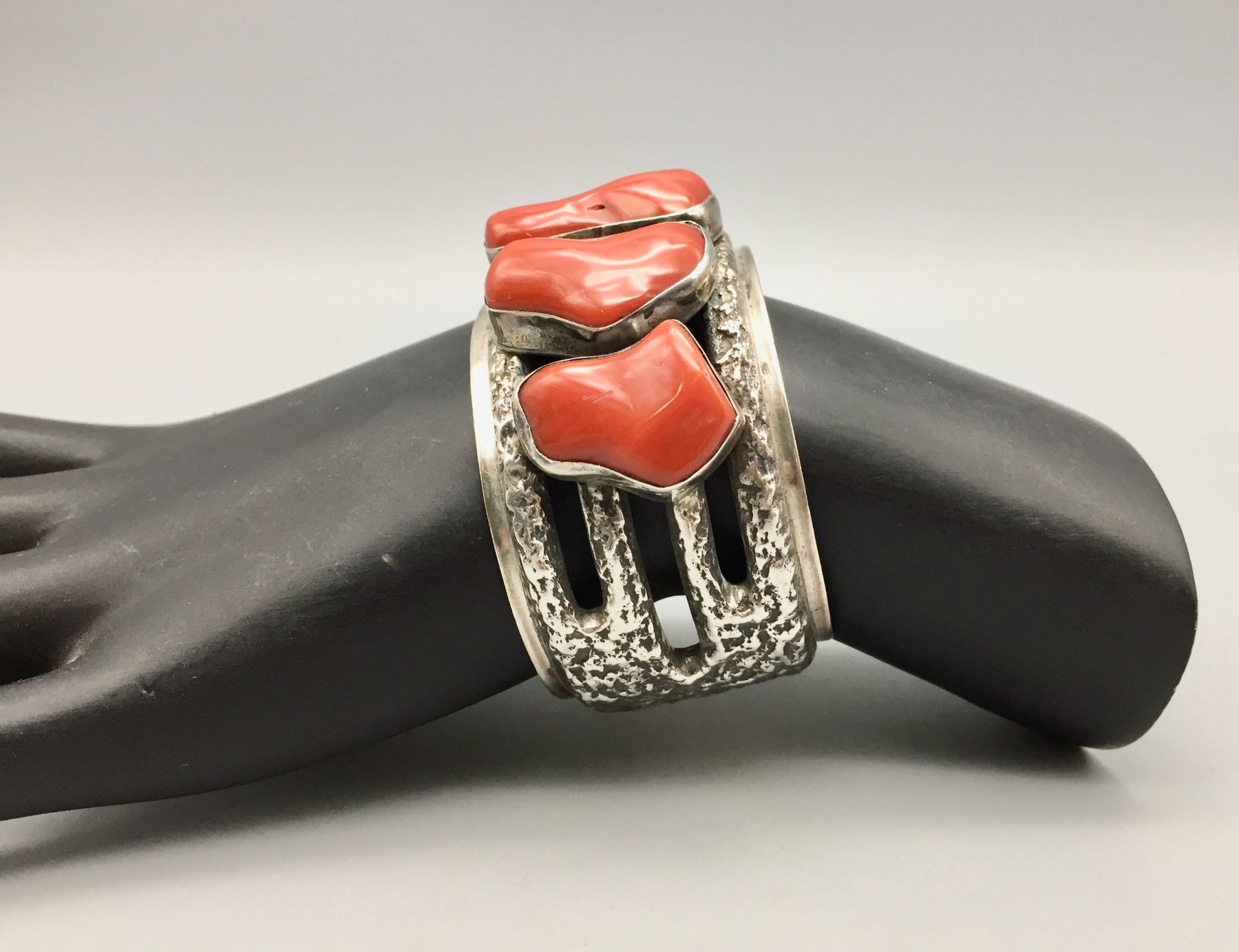 Description: Heavy 5 stone coral bracelet. NICE! Maker: Hallmarked, Aneme(?). Approx. Age: Vintage, circa 1970s. Size: Inside circumference measures approx. 5 1/8“ with a 1” gap (making this bracelet fit about a 6 1/8” wrist). It is 2 1/4” wide across the face and weighs 113.3 g. Condition: Good for its age, normal wear expected. Please look closely at the pictures - they are an important part of our description. Shipping: There will be a $5 handling / packaging fee for shipping this lot. The actual cost of postage will be added on top of that.