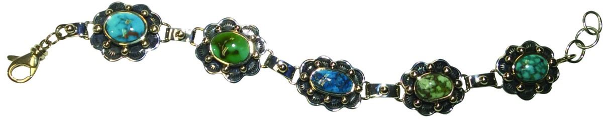 Once again, Greg Koschtial, of B-Dazzled, has designed a one-of-a-kind exquisite piece of jewelry for the WLF luncheon auction. This year, Greg has donated a 5-stone link bracelet, hand fabricated of hand-stamped 14K yellow gold and sterling silver surrounding 5 natural turquoise stones from the Southwest. The stones are Godber, Royston, and Damele from Nevada, and Morenci and Kingman Web from Arizona. The stones names are stamped on the back of each stone.