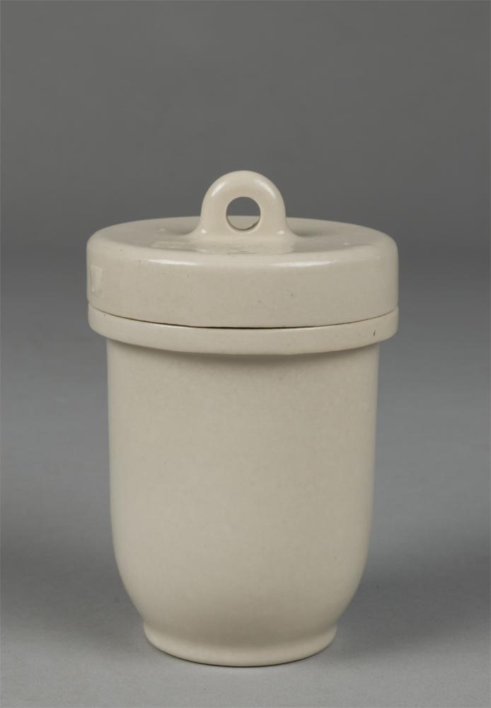 Includes a wood and stoneware wall mount salt box decorated in blue floral and scroll designs. A E.P. Shaw & Co. Ginger Beer bottle, a salt glazed covered container (lacking handle and crack), a brown glaze covered container and a small English lidded jar. Tallest measures 12.5" H. Together with a coffee grinder depicting a windmill on front with COFFEE on top, and two sailboats to either side. Mounted on painted yellow wall mount, missing glass bottom. 15.25" L, paint loss, rust and crazing on porcelain