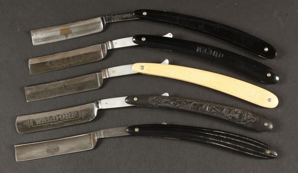 (1) Keen Cutter No. K1150 with black handle. (1) H. Boker, blade etched Waldorf, black handle carved with floral design. (1) W.R Case & Son's, handle carved with figure of woman's face. (1) Henry Sears #1256, blade etched "Queen". (1) Keen Kutter #88.