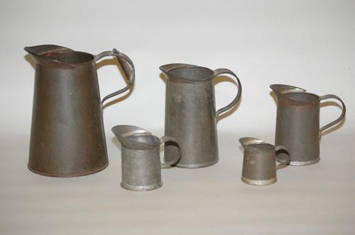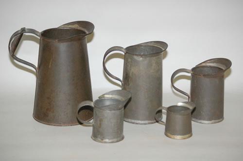 (5) TIN HANDLED MEASURES - GRADUATED SET OF (5) TIN HANDLED MEASURES W/ POURING SPOUTS: (1) 8 1/4", (1) 6 3/4", (1) 5 1/4", (1) 3 3/4" & (1) 2 3/4"- UNMARKED - WEAR, OXIDATION, DENTS, IMPERFECTIONS